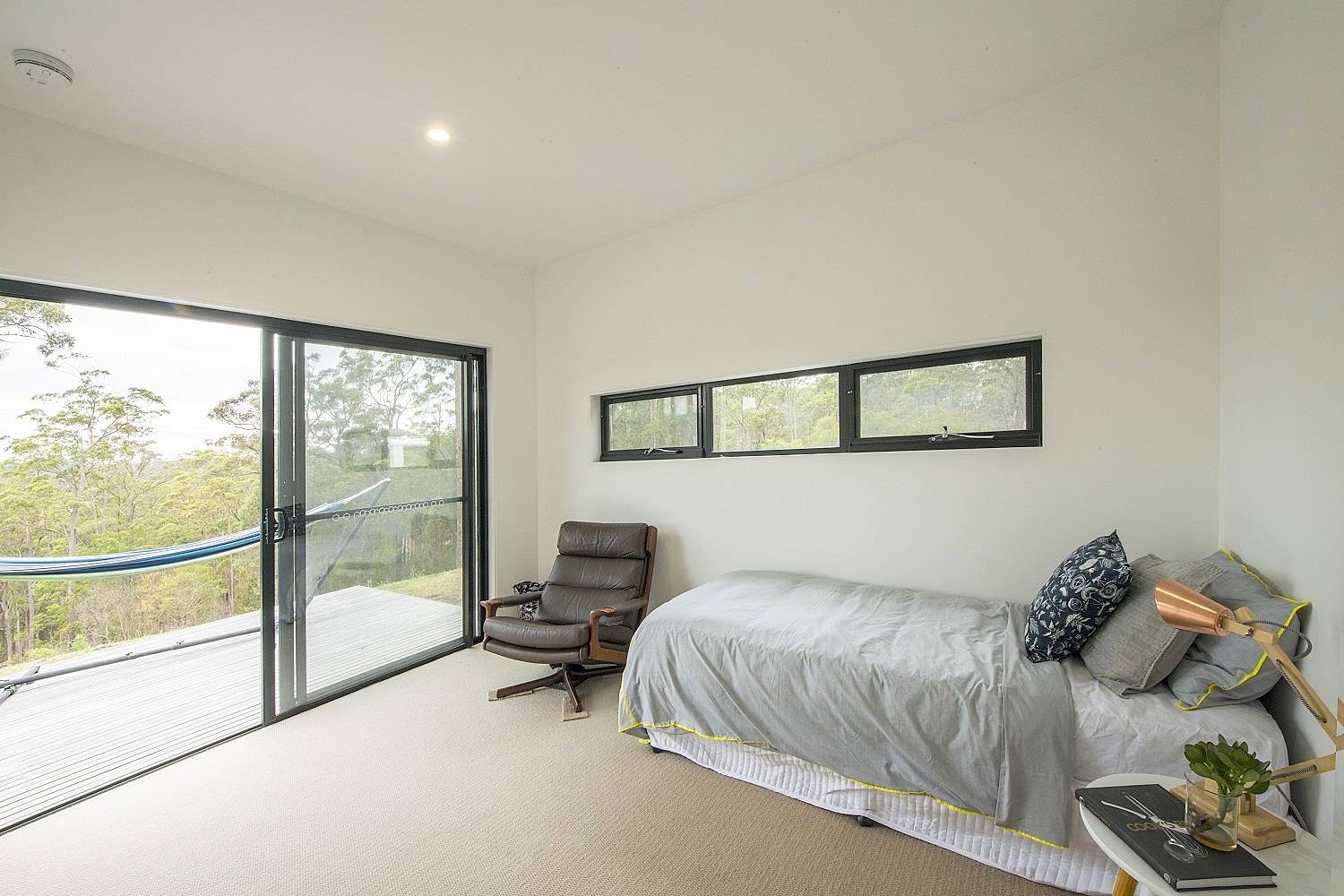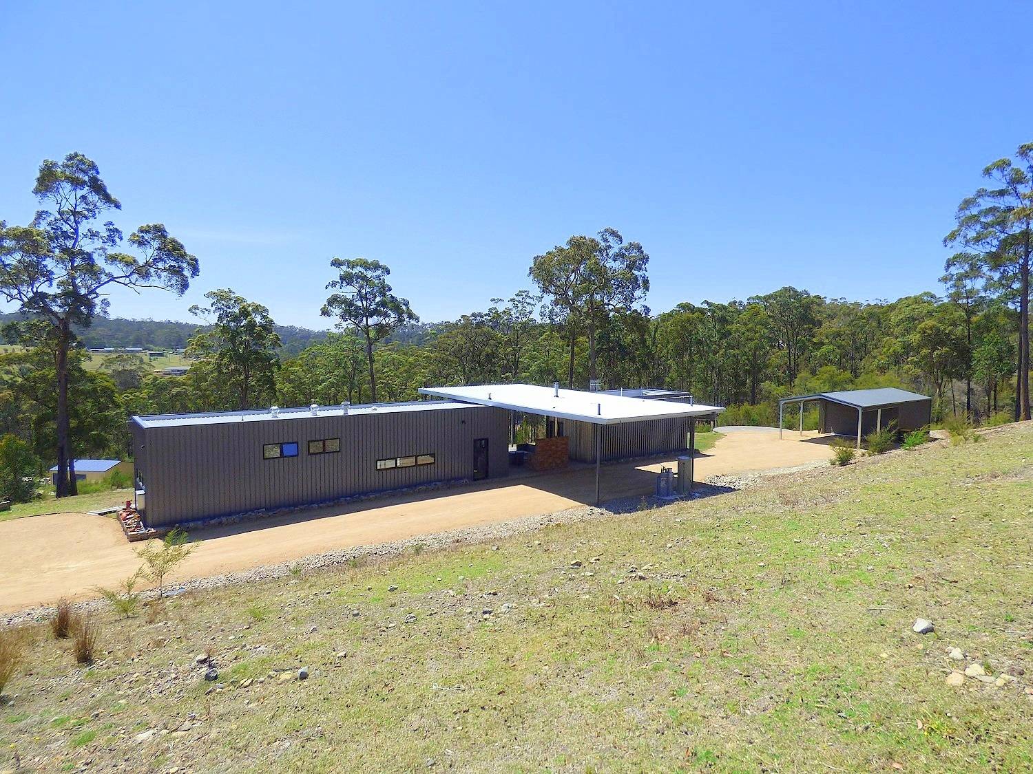Stunning contemporary designer home tucked away in ever popular Bald Hills on 4.6 private native bush acres offering impressive views & a glorious sun drenched aspect. Extensive iron bark decking ensures the flow from indoor to out of the bespoke 3 BR residence which features 3.8m ceilings, 5 star insulation, double glazing, hoop pine joinery & silvertop ash cladding. Light filled open living featuring a sheik soft close custom kitchen with a full array of appliances, breakfast bar & servery to enormous outdoor covered entertainment/living (complete with wood heater), 2 quality bathrooms, BRs all with deck access + BIRs (2 BRs ensuited). Brilliantly located just 5 min from Pambula Village (8 mins to beach) easy access, extensive driveway & parking incl. huge double carport, detached colorbond double garage/workshop plus cabled carport, good stand of parklike native bush to wander through & clear spring fed dam. Designer living meets lifestyle of choice.
