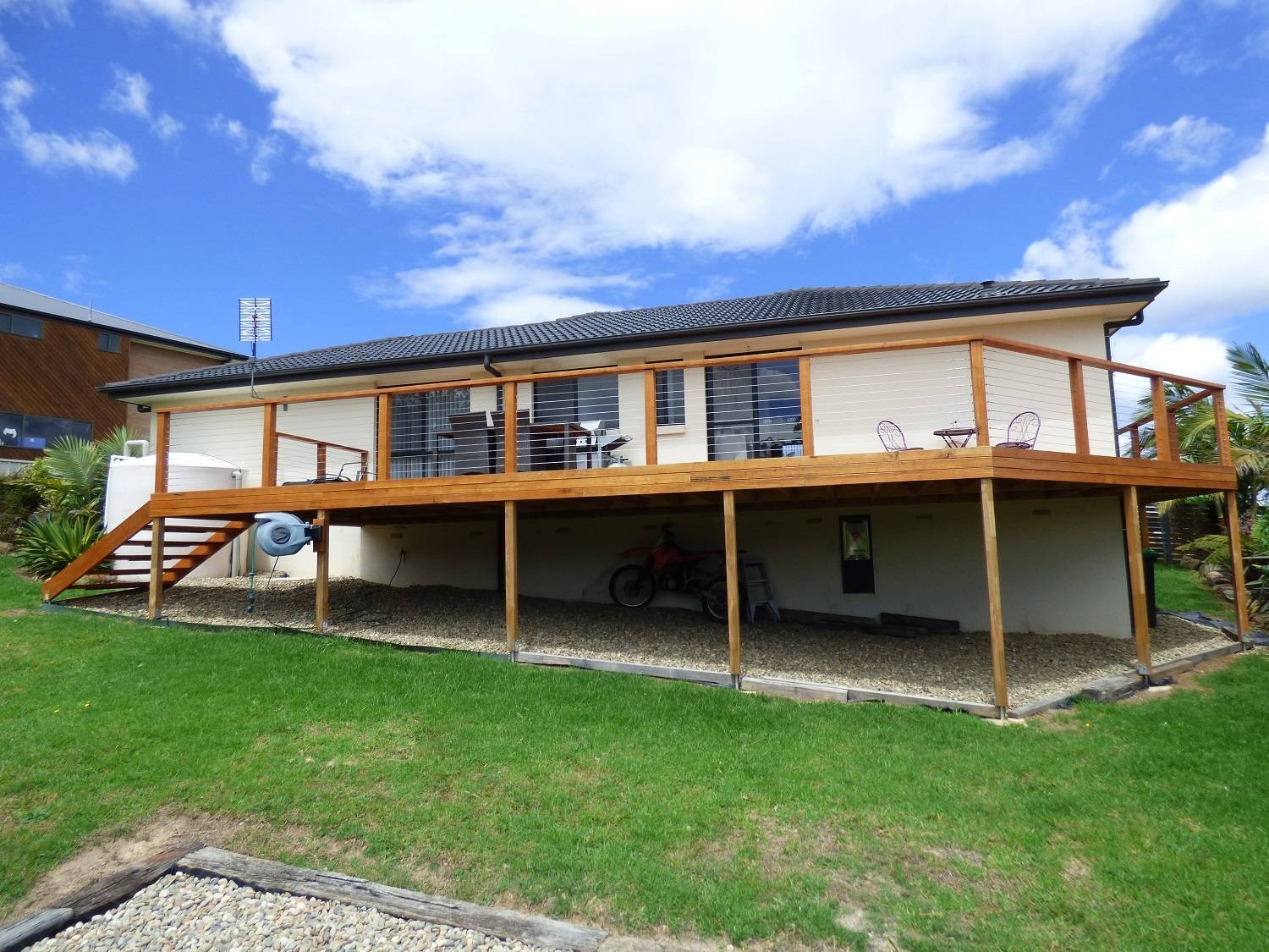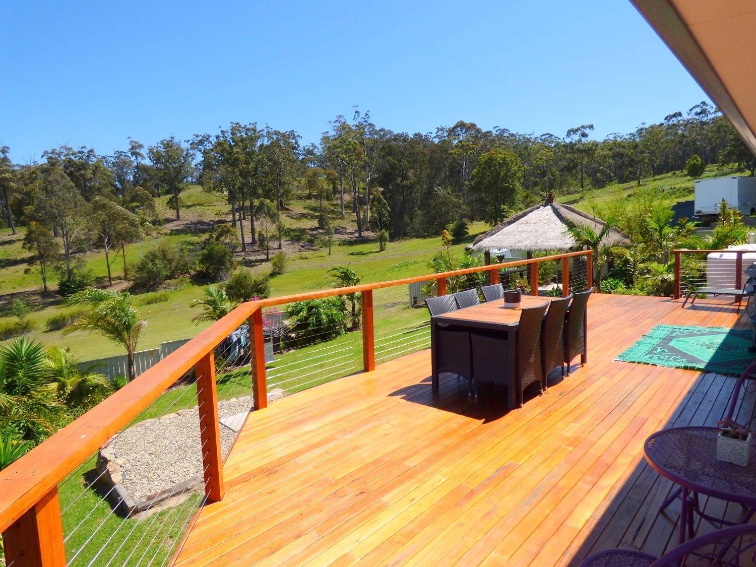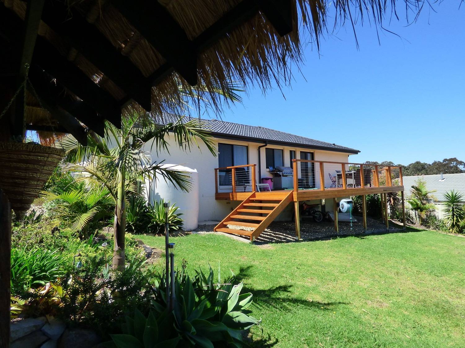 Striking 3 bedroom home set on a brilliant 953m2 block boasting an all day sunny aspect and lovely views towards Ben Boyd National Park. Nestled in the quality Eden Cove Estate, the home perfectly captures the outdoor lifestyle with a massive outdoor deck and freestanding Balinese inspired thatched roofed entertainment pavilion to the rear. Internally, features include generous open living (s/c heating & split system) flowing through to a fully appointed kitchen with breakfast bar, master bedroom directly accessing a generous 2 way bathroom (sep.WC), bedrooms are all good sized (BIRs) and complete with easy access L/U garage. Fully established surrounds including fenced rear yard. It’s an easy move.