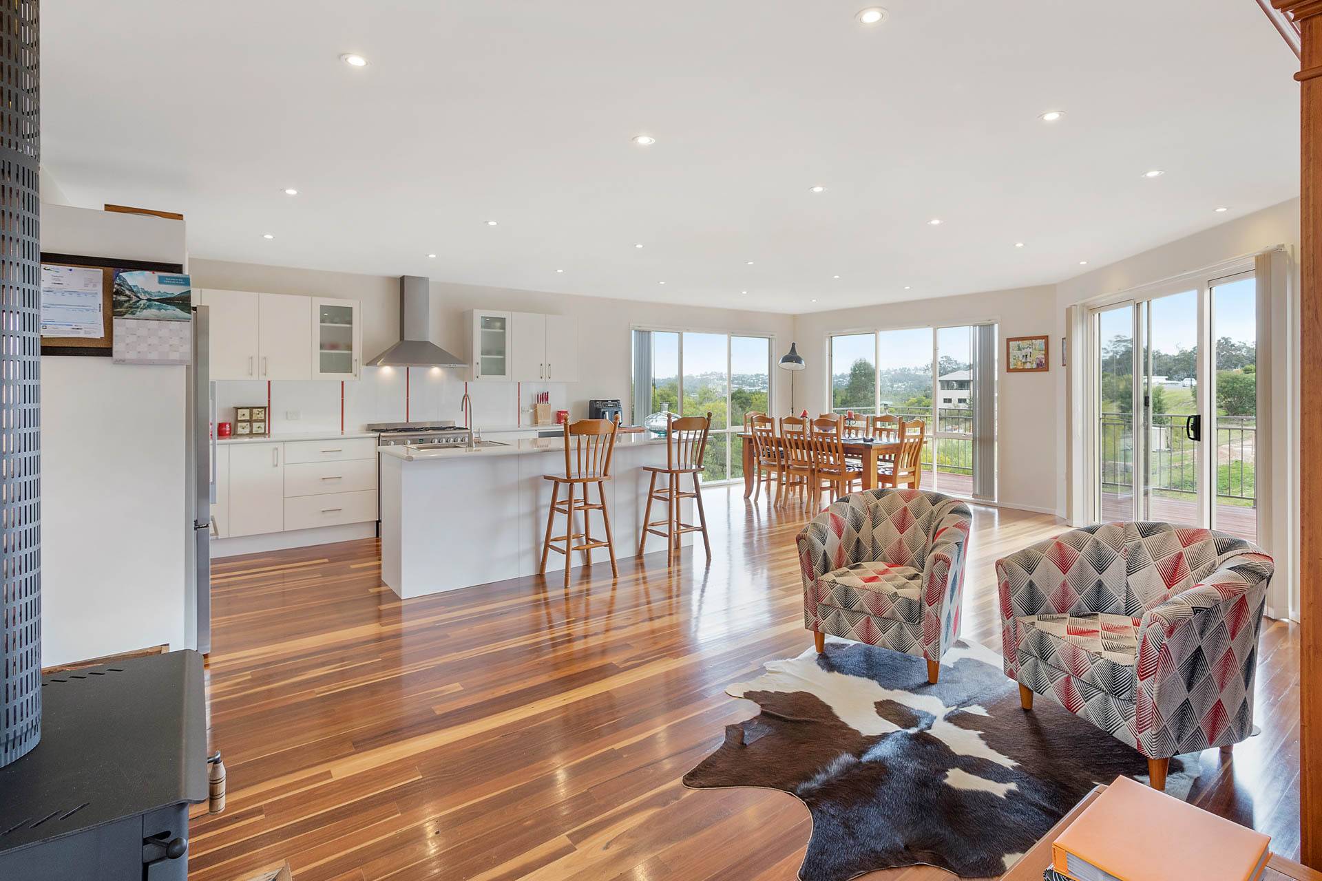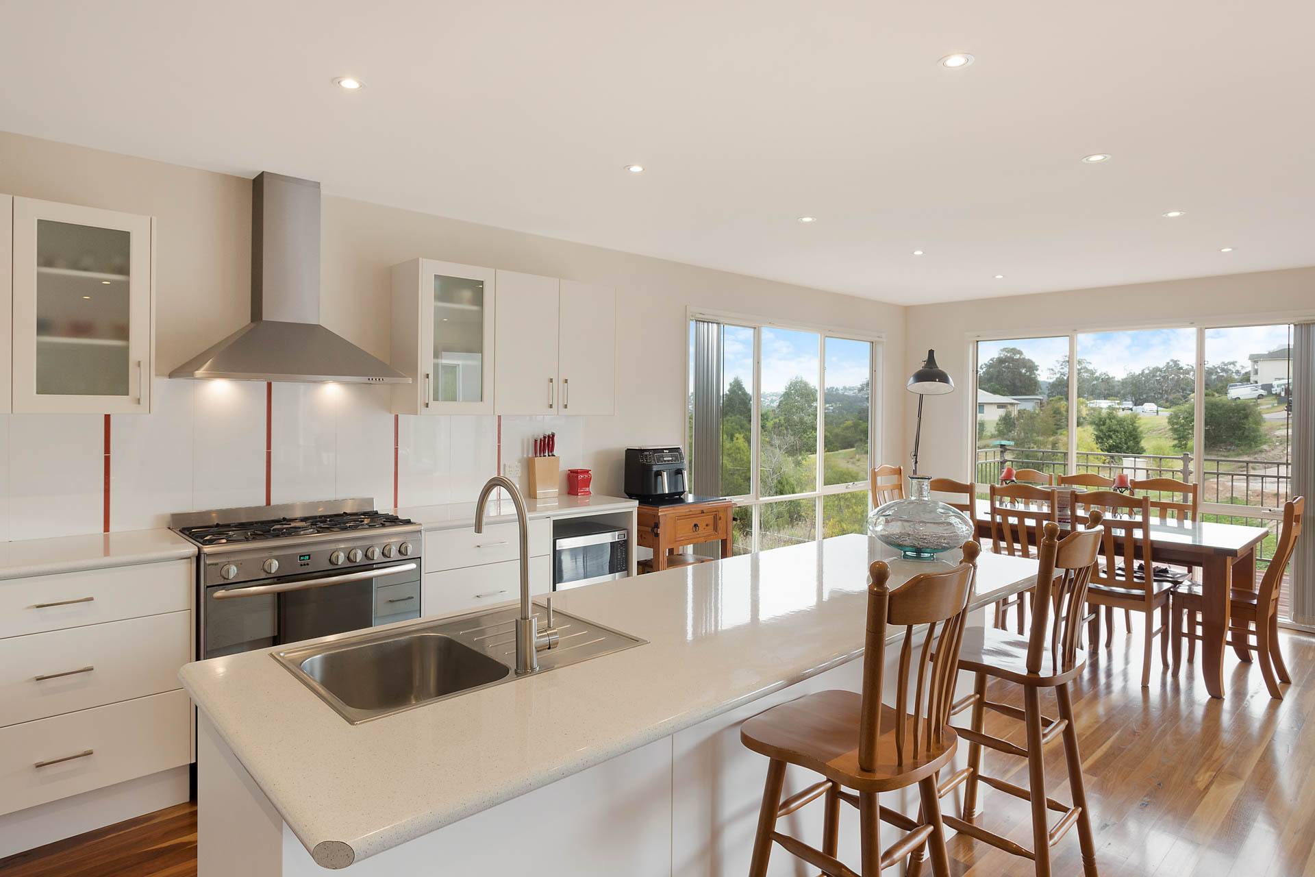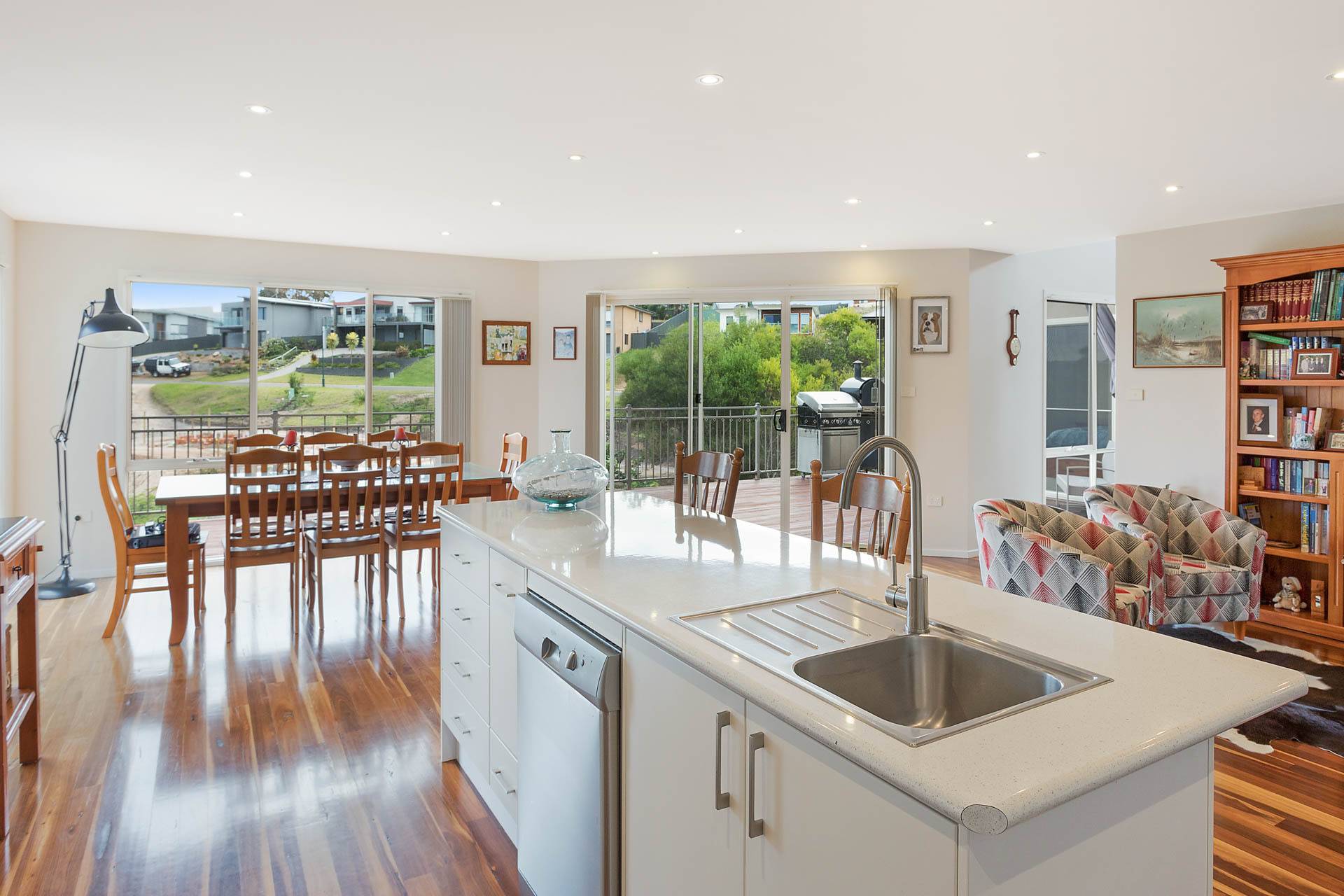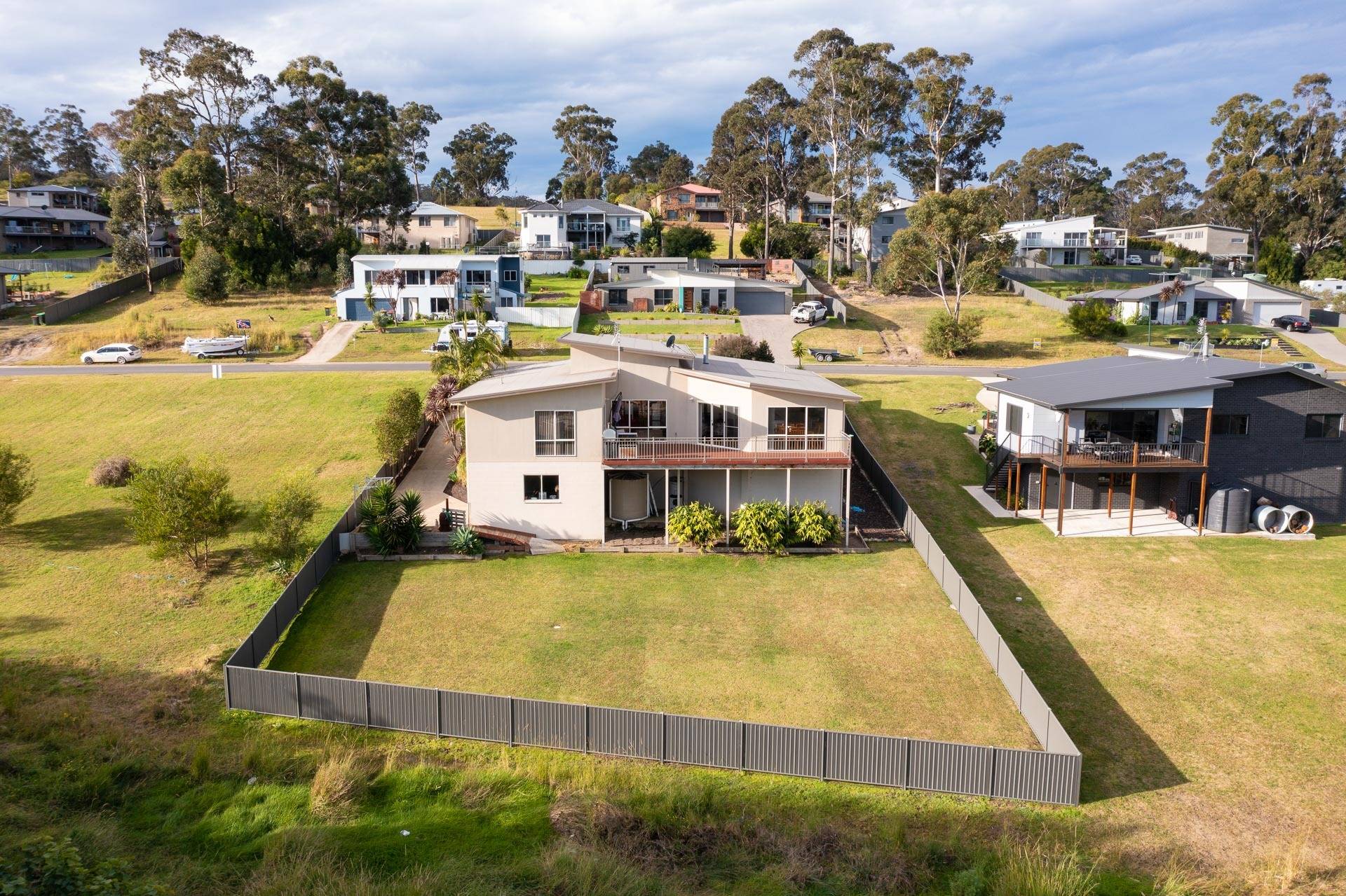 Fabulous three bedroom plus study (4th BR) designer home, set on a whopping 1067m2 block, adjoining foreshore reserve to the rear giving direct foot access to Lake Curalo Estuary + boardwalk/cycle track which winds round to the powder white sands and gentle break of Aslings Beach and Ben Boyd National Park. Upon entry, the light filled vaulted ceilings and the sublime timber floors make an immediate impact, the formal lounge is the first of the 2 impressive living areas (s/c heater), through to the cavernous family and dining with a superb, fully equipped (inc 6 burner s.s gas range) kitchen at the fulcrum. Both living spaces are complimented with a large adjacent outdoor deck/alfresco/bbq area. King sized master br with generous WIR & fully tiled ensuite (his & hers vanities) oversized shower and direct deck access, good sized brs 2 & 3 with WIR & BIRs respectively and large study/office 4th br, main bathroom (vanity, shower bath) & sep wc, laundry and internal access double garage. In addition, there is a separately accessed, single garage/workshop adjoining a massive under house storage space. The surrounds are immaculate and fully established Extraordinary by design.