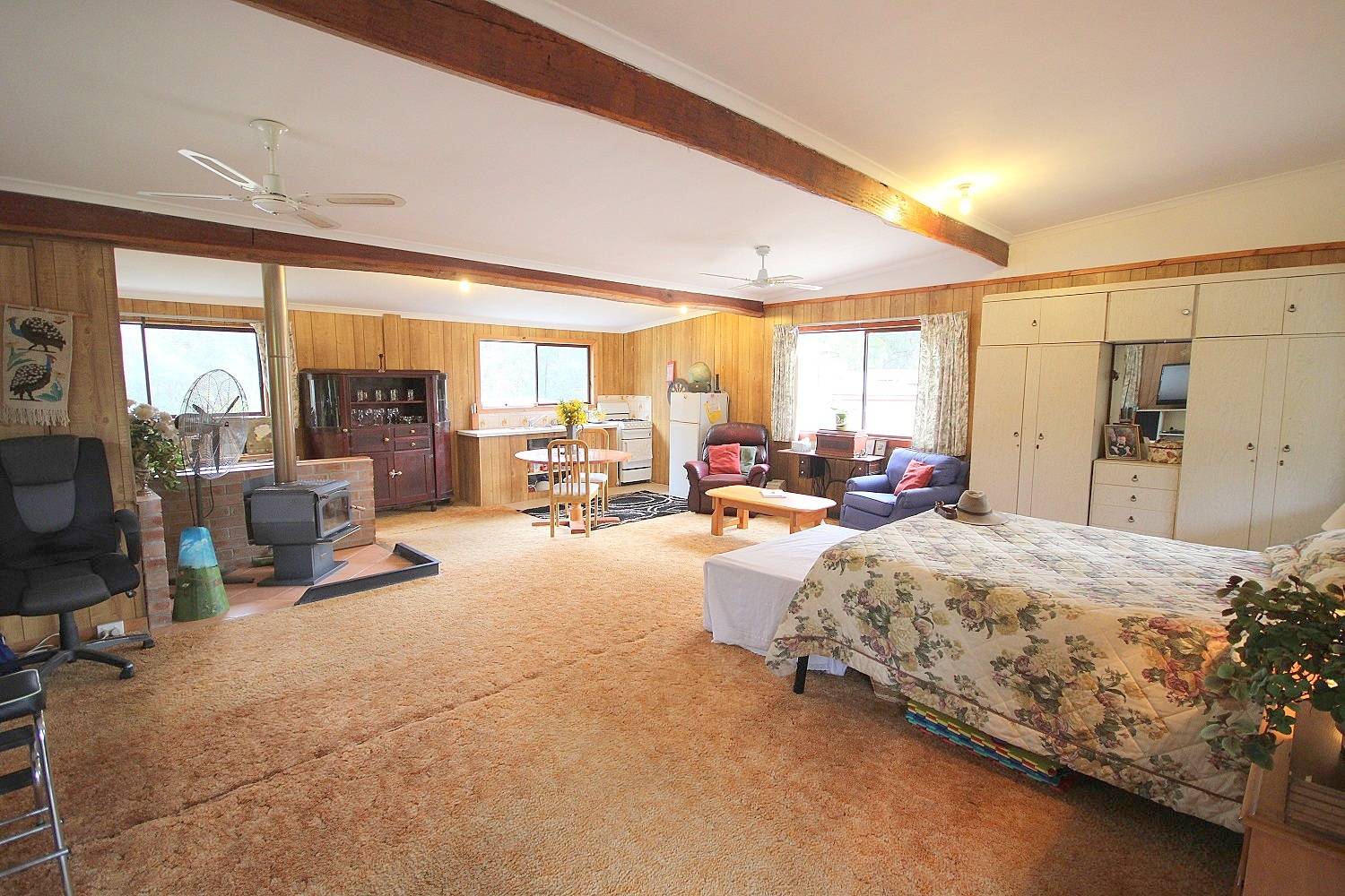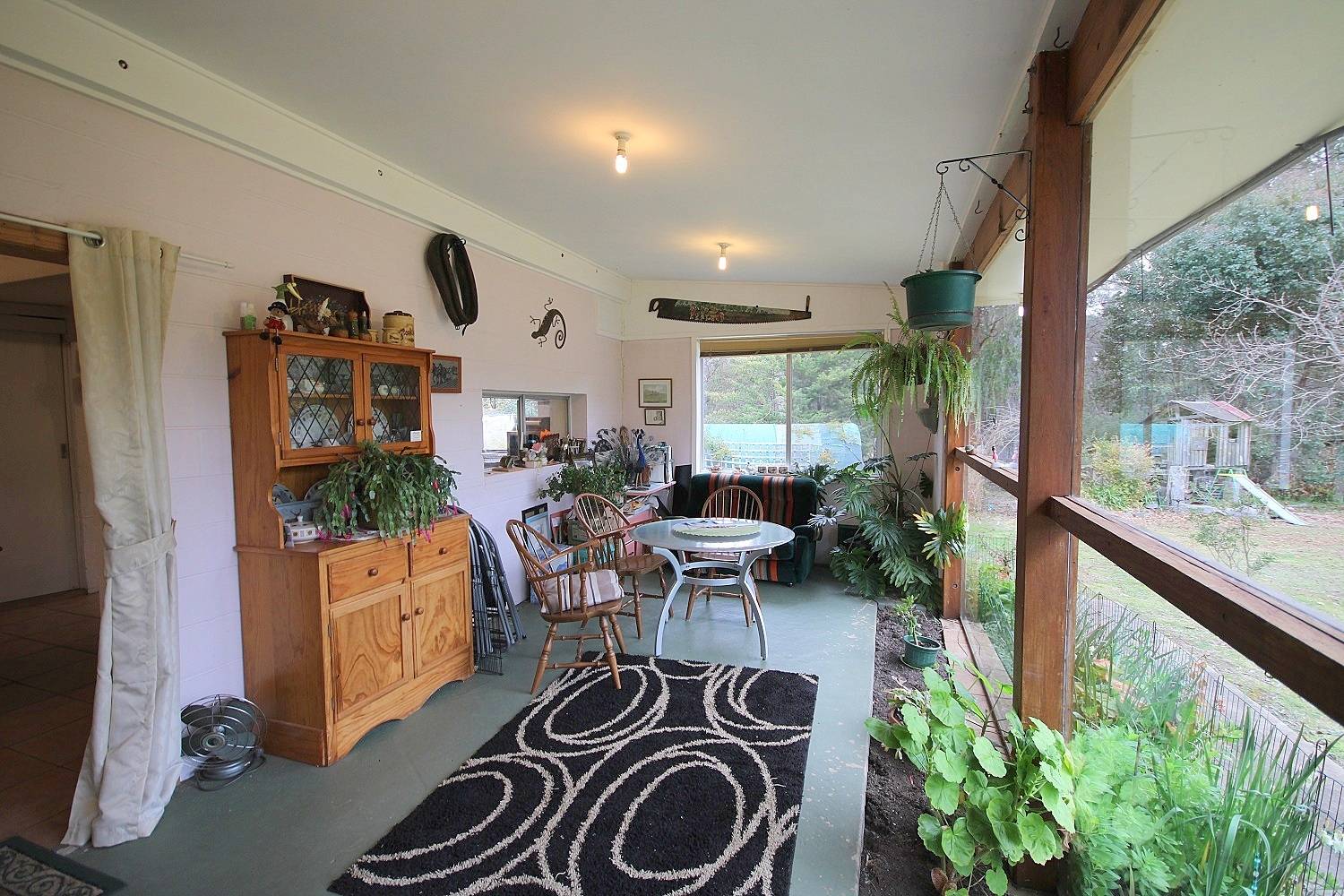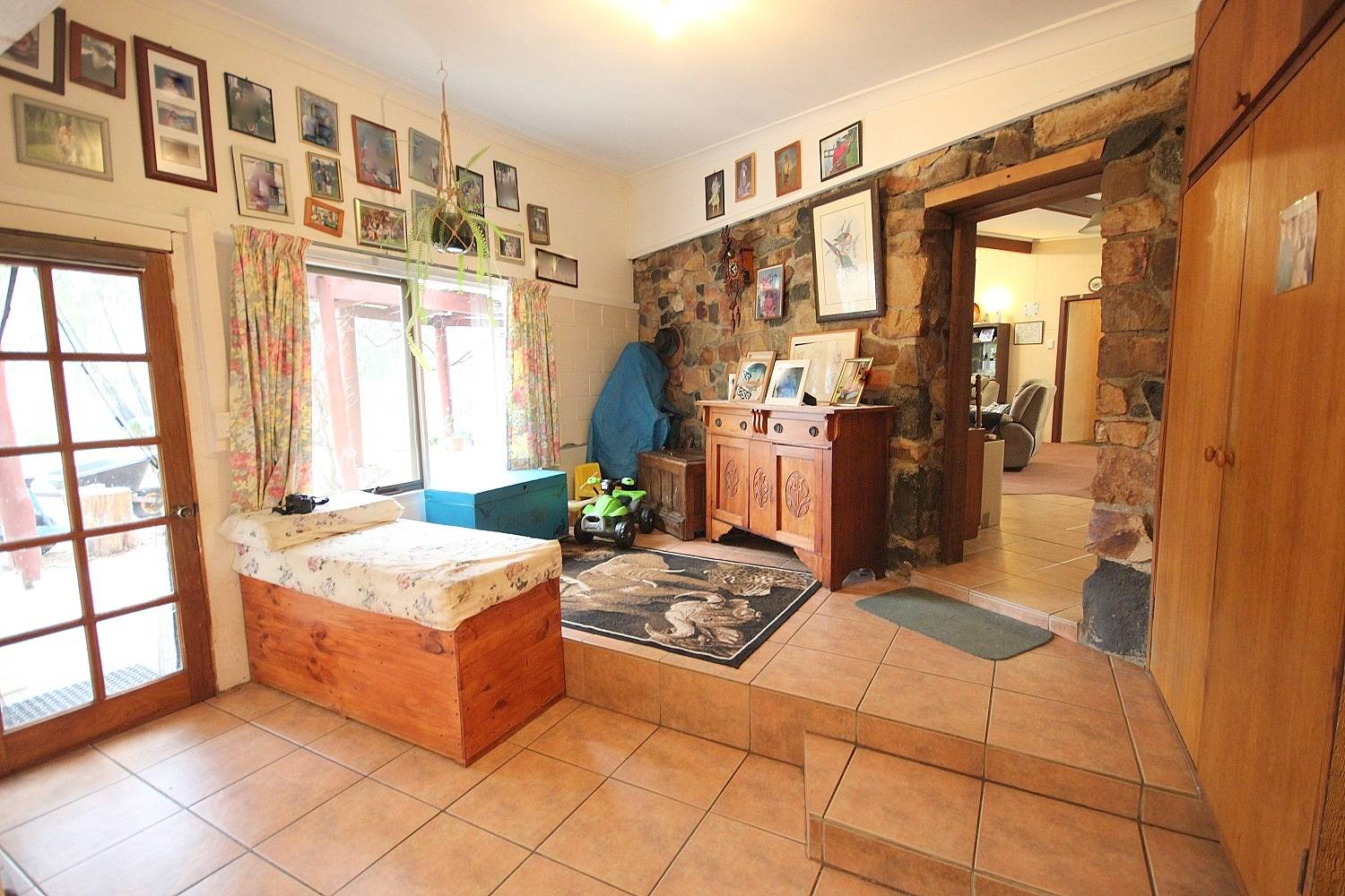 At first sight it is immediately apparent that the North facing, bespoke residence, built with a combination of stone and modern materials is totally at one with its beautiful 18 acre natural setting. The substantial home comprises 4 bedrooms (including loft/4th br), a wonderful main living with stone fireplace (s/c heater) & raked ceilings out to patio/verandah, huge upstairs second living area with kitchenette and under roof verandah to enjoy the amazing amenity. Kitchen/dining including 5 burner gas stove, fuel range ideal for cosy winters, timber bench tops and pantry, the adjoining dining leads through to a fantastic conservatory/sunroom, bringing the glorious surrounds indoors, 2 bathrooms, 3 wc’s and large country laundry. Other improvements include a double Colorbond garage/plus skillion workshop/store area, salt water chlorinated in-ground pool, enclosed 28 tree mixed orchard and vegie garden, plenty of tank water plus a 20m easement to the magnificent Myrtle Creek where a crystal clear water hole awaits (pump & line back to house). Easy gentle grade access, mains & solar power and reduced council rates due to a Voluntary Conservation Agreement. Just a 5 min drive to Wyndham Village (general store, school, community hall etc) & 30 mins to the beach. Just Right!