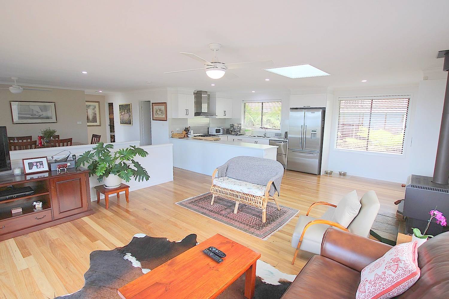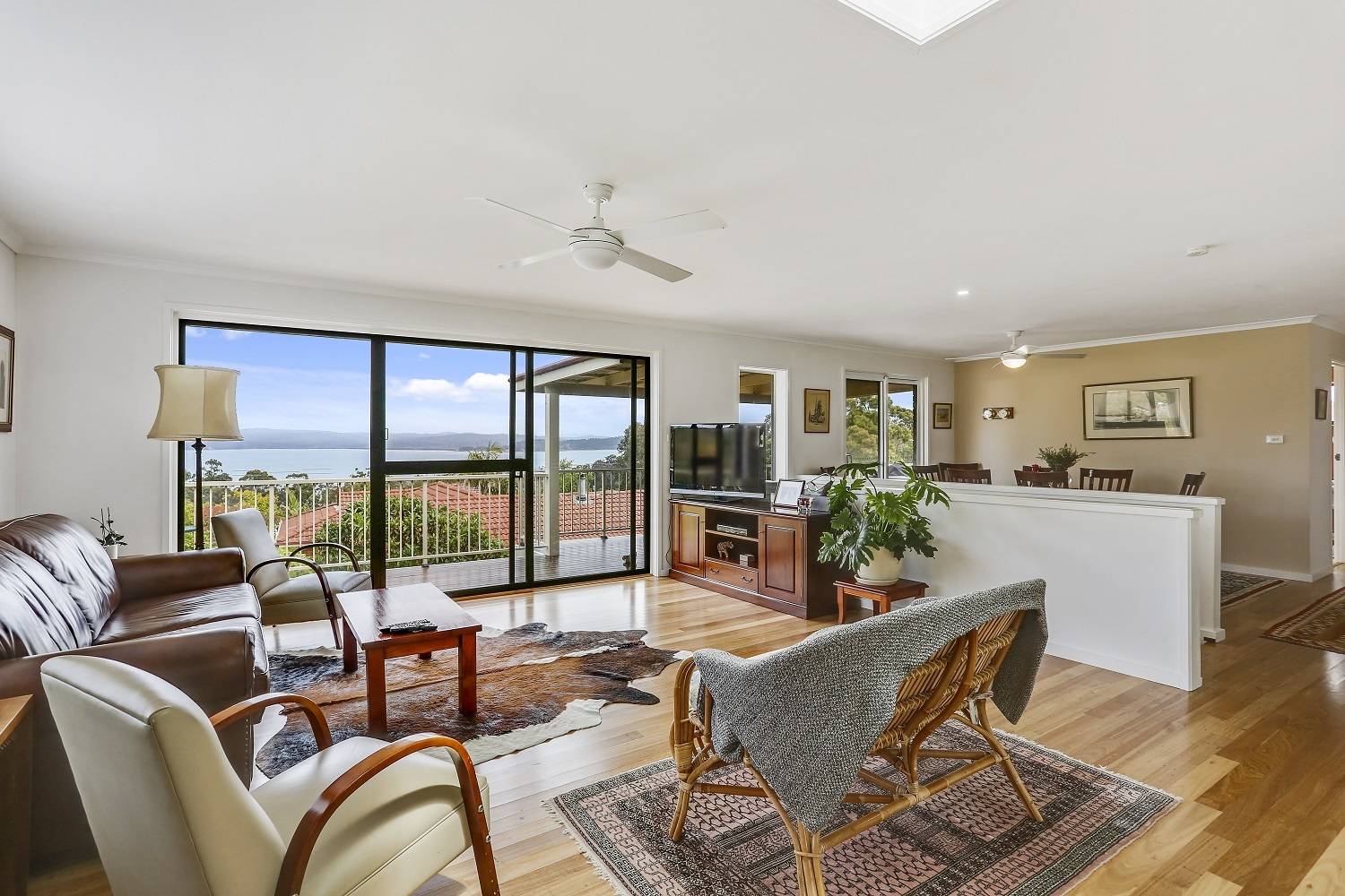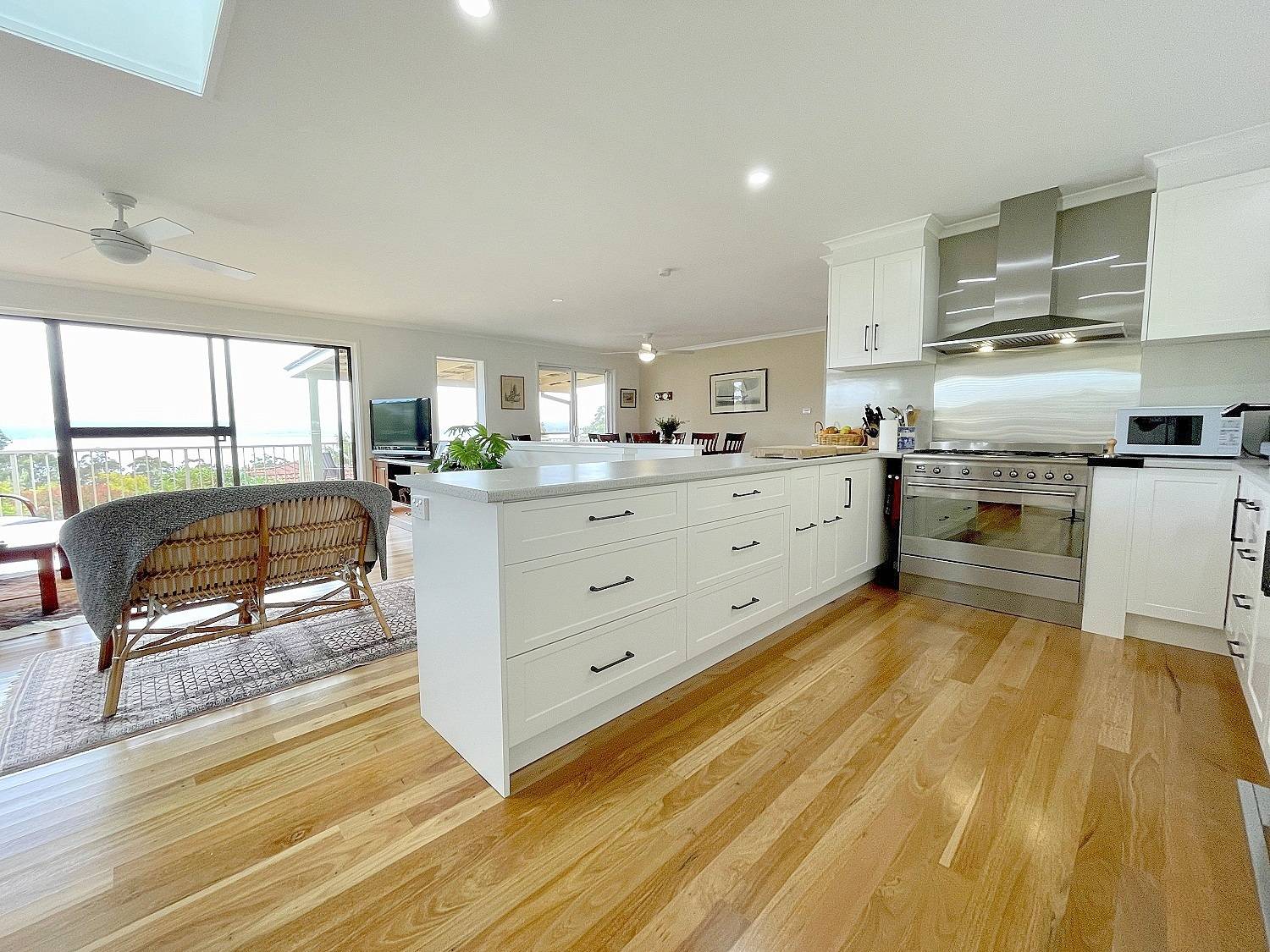 Absolutely divine 4 bedroom solid brick home positioned in a no thru street just a few hundred metres from the powder white sands & the gentle lapping shoreline of ever popular Cocora Beach. Featuring breathtaking water views out across the expanse of Twofold Bay stretching all the way to the hinterland & majestic Mt Imlay, the home provides a brilliant open living space boasting magic secret nailed hardwood flooring, brand new fully appointed soft closed gourmet kitchen with 5 burner gas range, dual draw dishwasher, excellent storage, massive bench top/breakfast bar and generous dining area all flowing out to a house length deck & covered pergola/alfresco living to luxuriate in the views. Master br (bir’s) & direct deck access with 3 way main bathroom adjacent, 2nd br (ensuite), 3rd br (bir’s), large 4th br/rumpus currently used as an office. Laundry & internal access to double L/U garage & workshop. Fantastic fully established low maintenance surrounds including raised veggie gardens, garden shed & fully fenced rear yard. You’ll feel like you’re floating on air.