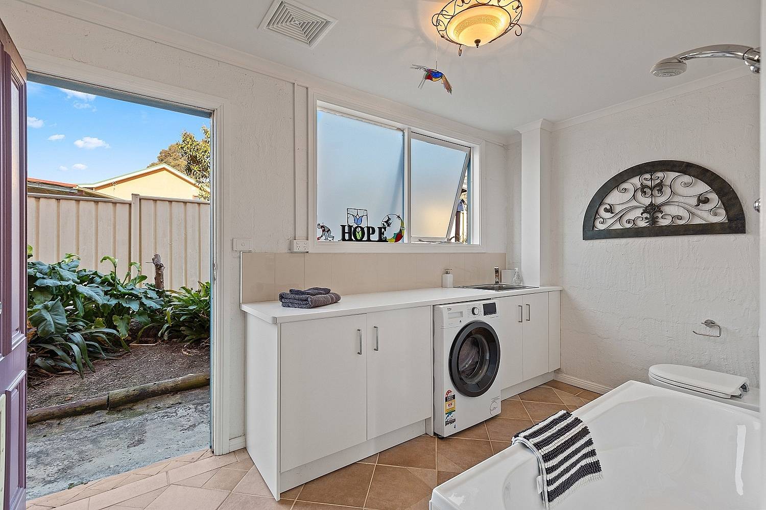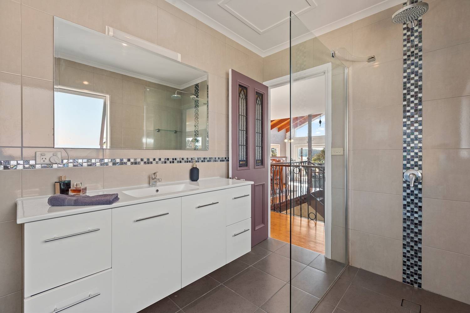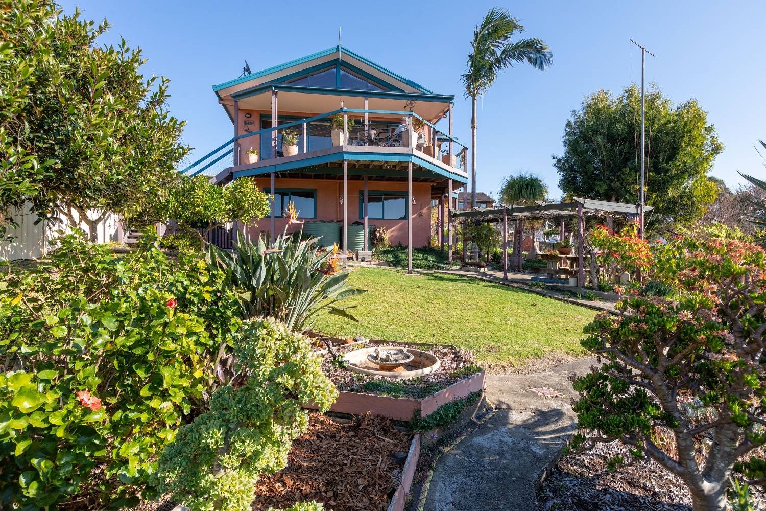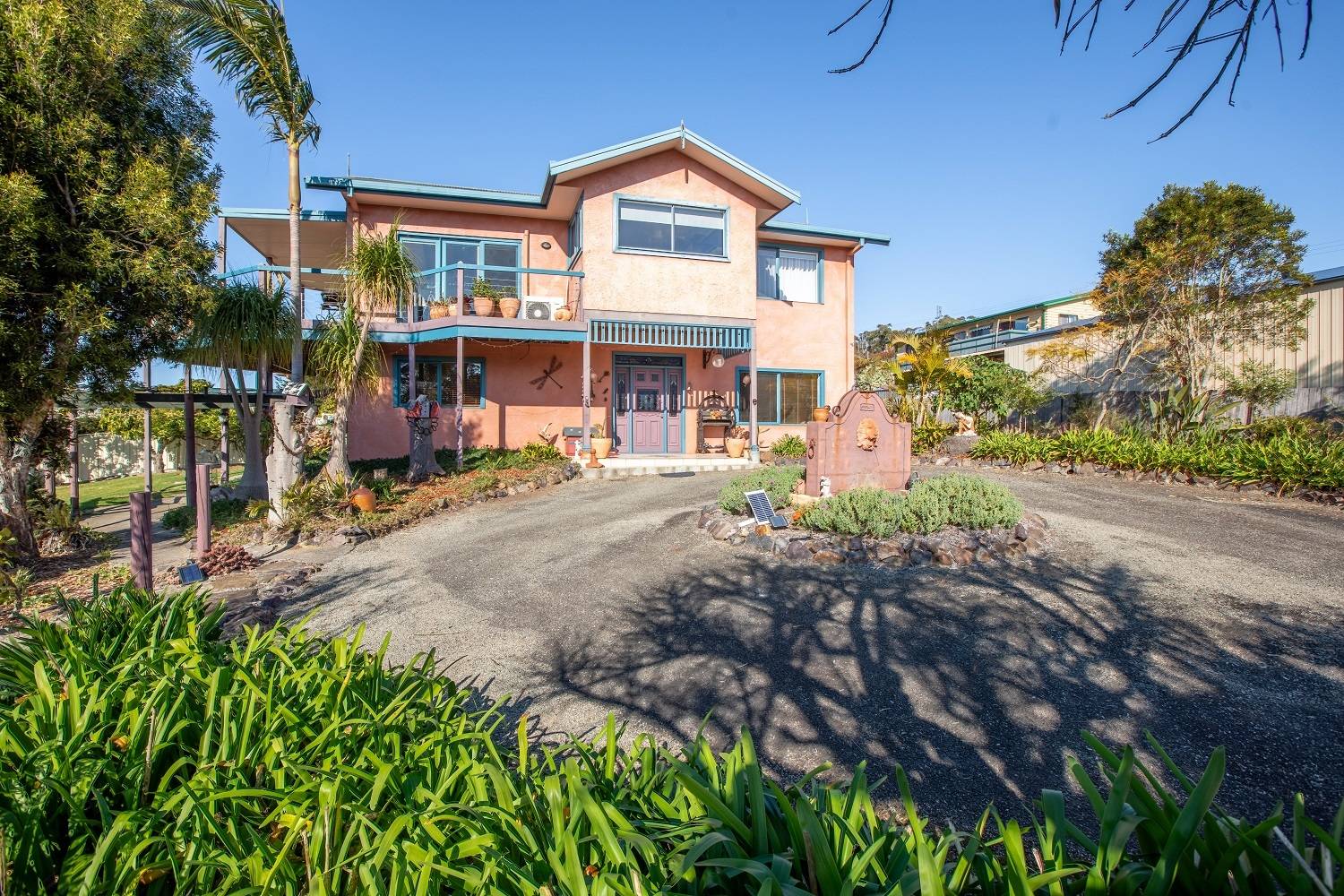 From the moment you enter through the wrought iron gates into the secluded ½ acre allotment you feel as if you’ve been transported to another world. Commanding in presence the brick 3 bedroom residence boasts the perfect North East aspect and comprises an impressive tiled entrance foyer (9ft ceilings) with adjacent living area, 2 king sized bedrooms (BIR’s), combined bathroom/laundry, bath/shower, vanity, wc, built in cupboards and trough. Then up the impressive staircase to a wow of a living space, cypress pine floor and raked ceiling where the big blue water views are on full display out to a partially covered deck to enjoy the sweet sea breezes. Spacious fully equipped (900mm range etc) kitchen with adjacent dining. Master suite features bespoke lead light feature windows and BIR and sparkling fully tiled main bathroom (shower, vanity & wc). The glorious surrounds are like an oversized European court yard including veggie gardens, citrus trees, pizza oven and many established plantings plus a freestanding 11m x 6m garage/workshop complete with its own wc, shower and trough. A world of difference.