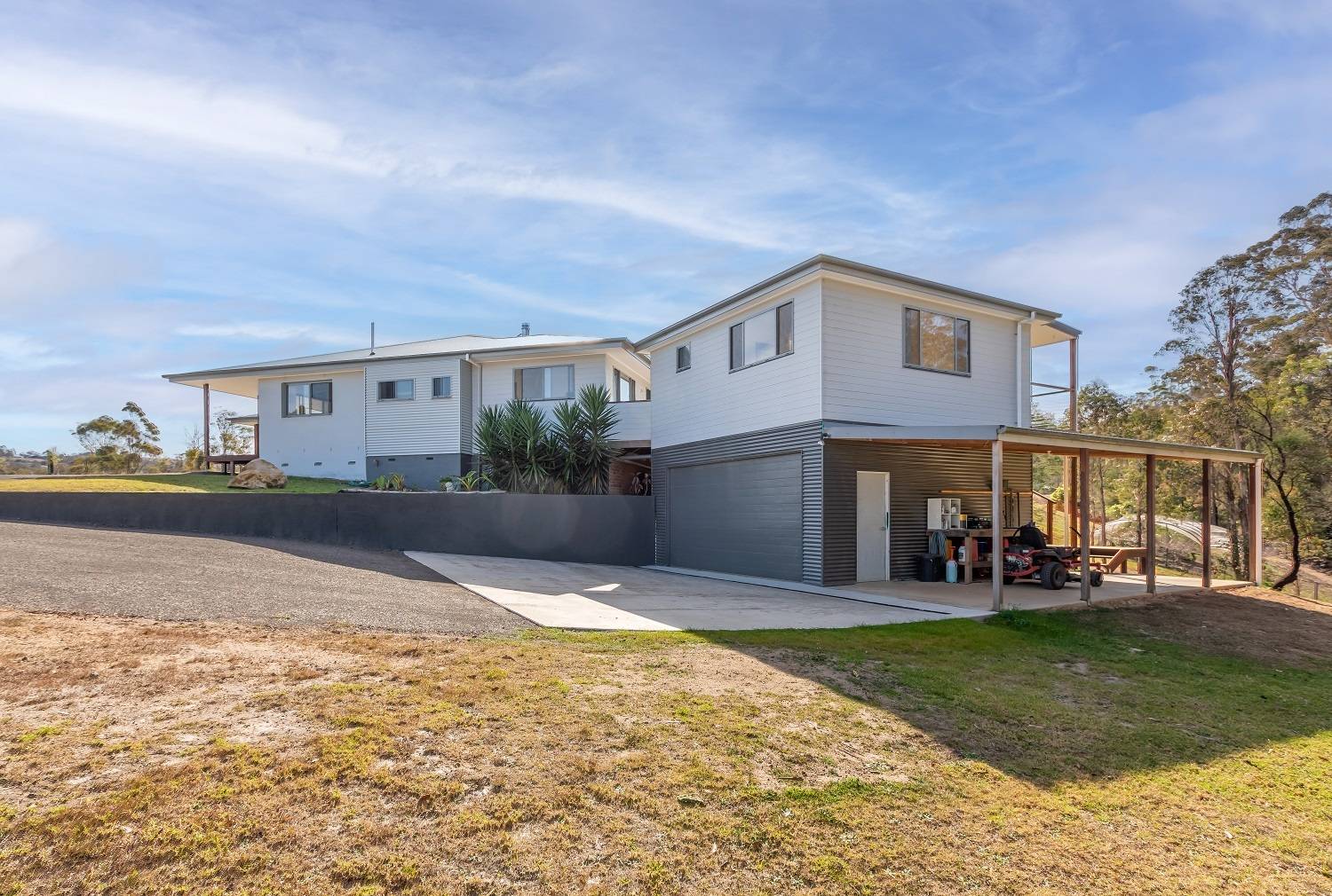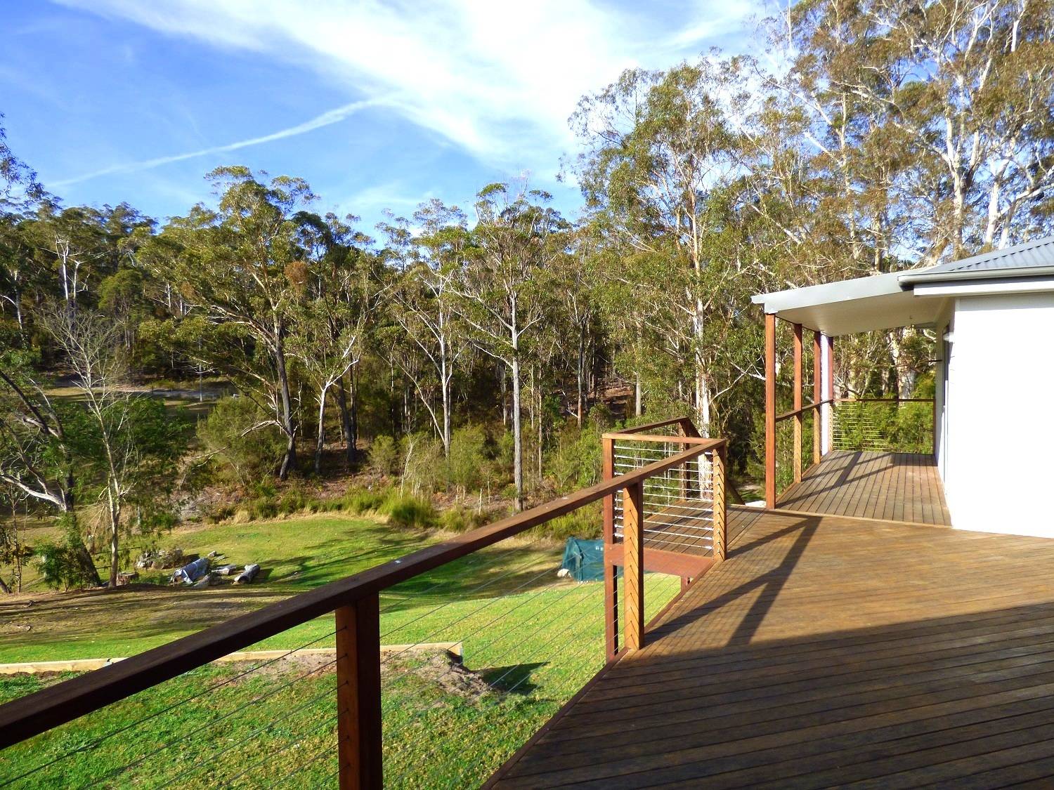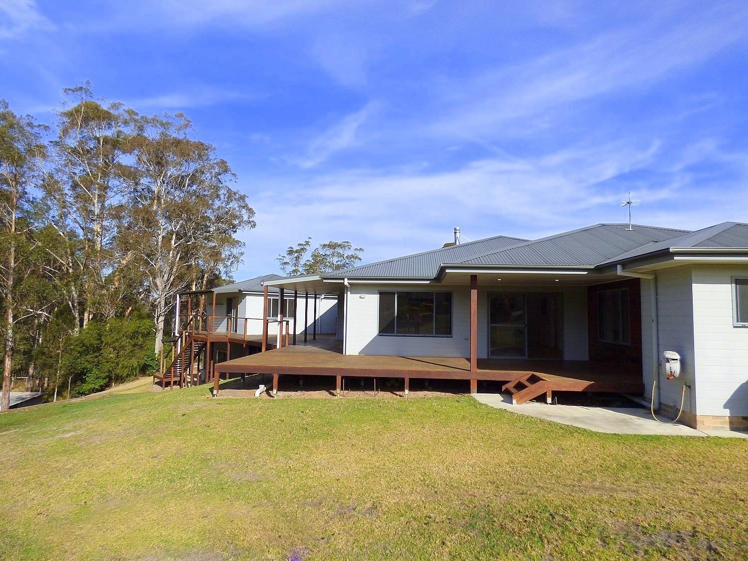 One and a half gorgeous acres, mainly cleared, with a good stand of mature eucalypts to the rear and even a small section of creek flat, complete with an outstanding 4 bedroom residence plus free-standing self contained studio/guest accommodation, sublimely positioned just touching distance (1 min drive) from vibrant Pambula village and just 4 min to the beach. Sound amazing? Read on – builders own home perfectly sited to maximize the unique allotment, cavernous open living and dining area (s/c heating & split system), gorgeous hardwood floors effortlessly flowing out to extensive decking including 2 private covered alfresco areas. Sleek fully equipped kitchen, master bedroom inc ensuite (shower, vanity& wc) & WIR, generous in size brs 2,3 & 4 each with BIRs, TV room/utility, large home office with external access, main bathroom inc shower, bath, vanity plus sep wc, laundry and adjacent 4th wc. Linked by decking from the residence is a magic self contained studio/apartment perfect for family or friends which literally floats in the tree tops. Additionally, this cracking property provides a double under roof direct house access carport, double l/u garage plus adjoining skillion perfect for boat/caravan etc, even a farm/wood shed with a rear access track. Totally on Toallo – Available for immediate inspections.