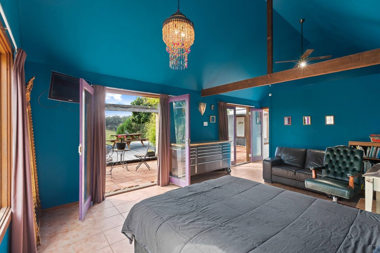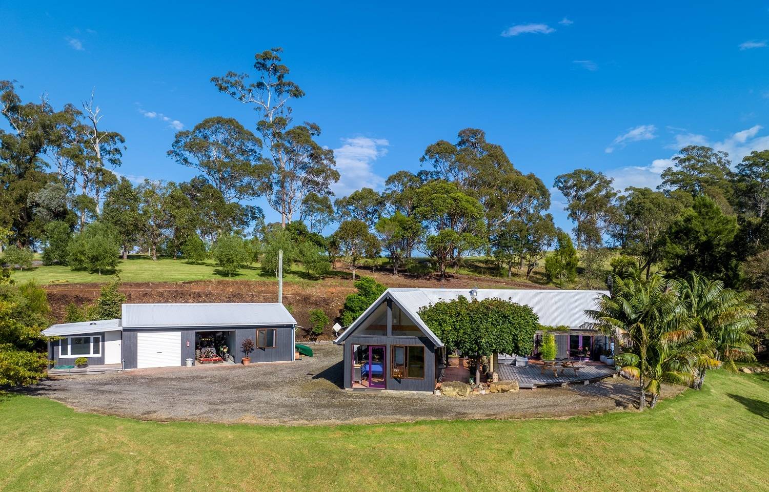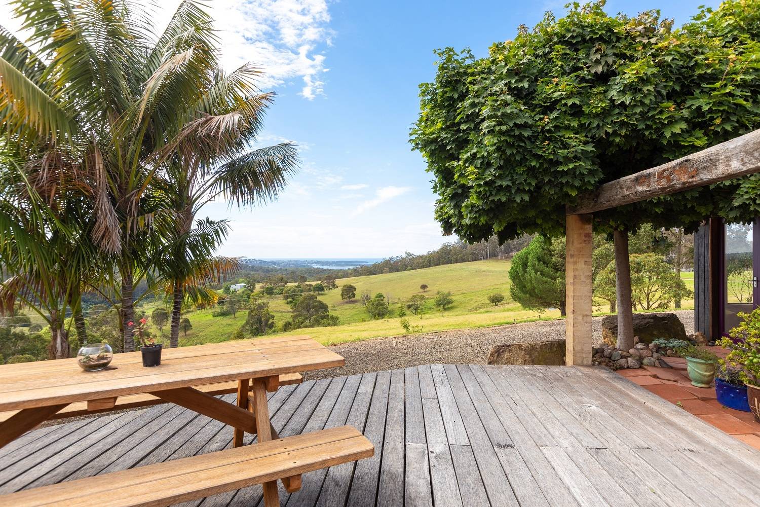 Exquisitely nestled on the escarpment in the ever desirable Woodlands Lane, Bald Hills and providing inspirational rural vistas all the way to Merimbula Lake, Short Point and beyond to the vivid blue of the South Pacific, captivating 2 bedroom plus study residence and a generous 4 roomed freestanding studio. Positioned on 14 sheltered, fertile basalt acres, boasting the classic North East aspect, the home is centred around a divine European-like paved and decked courtyard/alfresco living area and oozes bespoke features and designer chic. Internal volume and space are added to each room with voluminous raked ceilings, the home’s composition includes open living and dining with a funky minimalist kitchen (inc s/s splash backs) at the fulcrum, all flowing out to the North facing paved pergola, king sized master (direct courtyard access) and WIR, 2nd bedroom (BIRs), study with external access, stunning designer bathroom plus sep wc and laundry. The cottage/artist’s studio comprises 2 large living/work spaces, bedroom, ensuite and a double l/u garage. The gorgeous surrounds are fenced with many exotic plantings including Lord Howe Island Kentia palms (there is even a Banyan Tree), lush pasture , 2 permanent dams and 110,000 litre concrete water tank. Clean fresh air, quiet country lane yet only minutes (5 min drive) to all the amenities of vibrant Pambula Village and extra 3 to the beach. Breathless in Bald Hills.