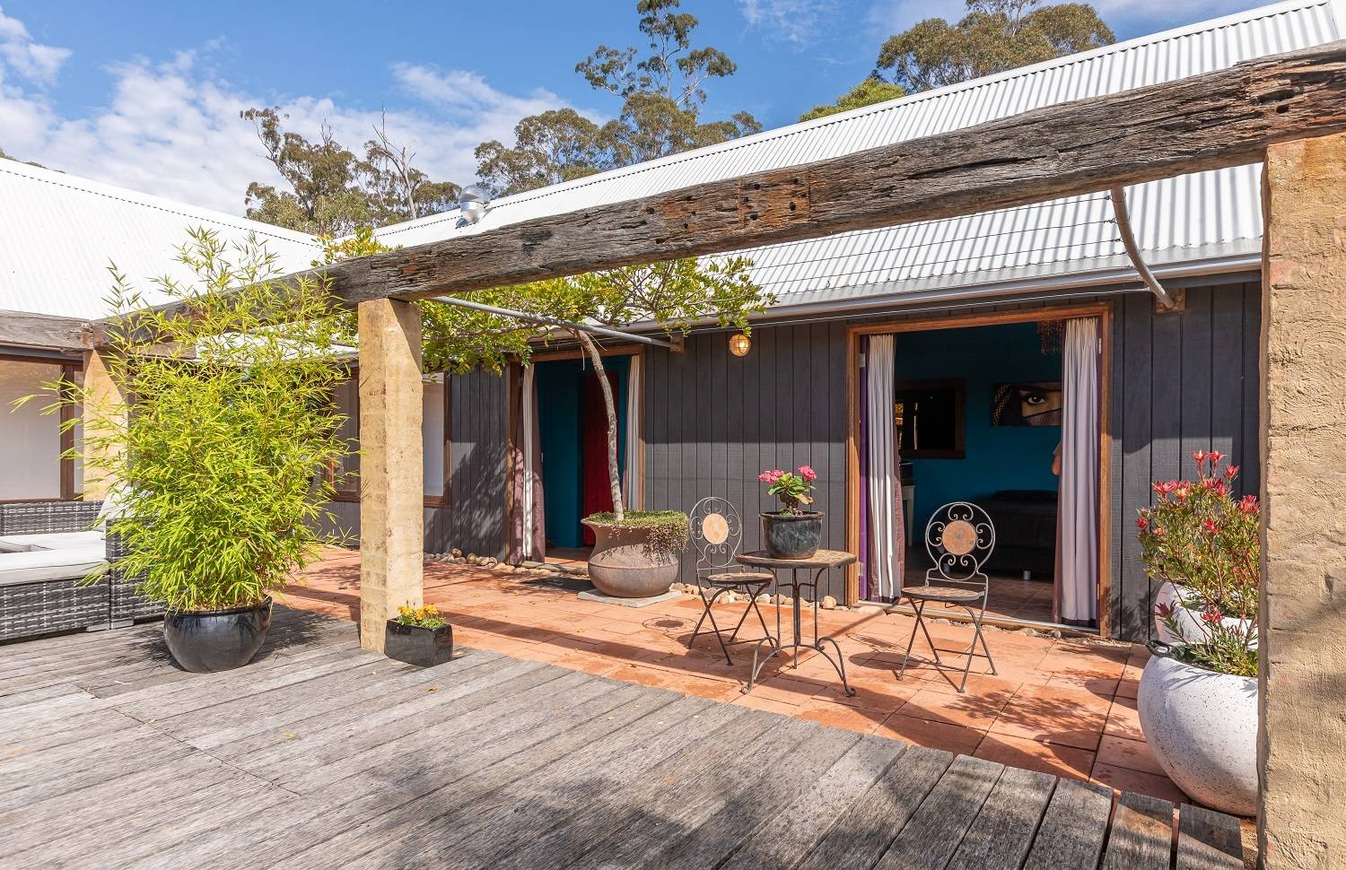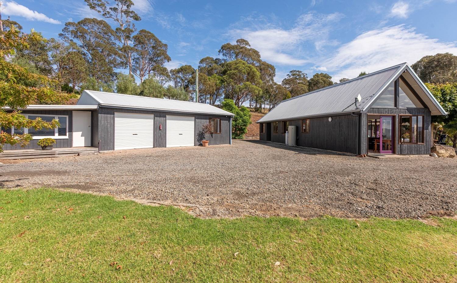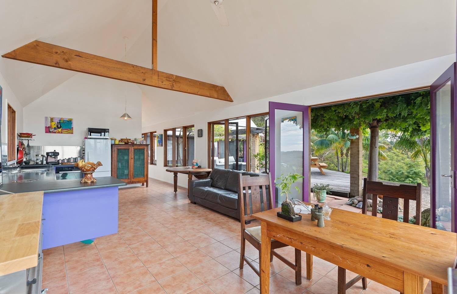 Exquisitely nestled on the escarpment in the ever desirable Woodlands Lane, Bald Hills and providing inspirational rural vistas all the way to Merimbula Lake, Short Point and beyond to the vivid blue of the South Pacific, captivating 2 bedroom plus study residence and a generous 4 roomed freestanding studio. Positioned on 14 sheltered, fertile basalt acres, boasting the classic North East aspect, the home is centred around a divine European-like paved and decked courtyard/alfresco living area and oozes bespoke features and designer chic. Internal volume and space are added to each room with voluminous raked ceilings, the home’s composition includes open living and dining with a funky minimalist kitchen (inc s/s splash backs) at the fulcrum, all flowing out to the North facing paved pergola, king sized master (direct courtyard access) and WIR, 2nd bedroom (BIRs), study with external access, stunning designer bathroom plus sep wc and laundry. The cottage/artist’s studio comprises 2 large living/work spaces, bedroom, ensuite and a double l/u garage. The gorgeous surrounds are fenced with many exotic plantings including Lord Howe Island Kentia palms (there is even a Banyan Tree), lush pasture , 2 permanent dams and 110,000 litre concrete water tank. Clean fresh air, quiet country lane yet only minutes (5 min drive) to all the amenities of vibrant Pambula Village and extra 3 to the beach. Breathless in Bald Hills.