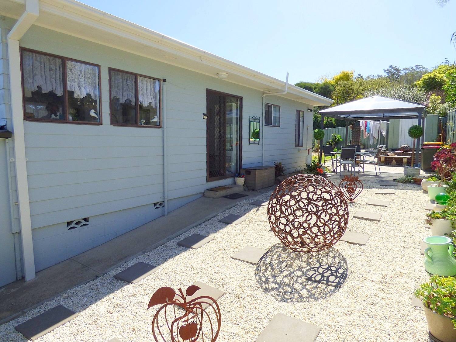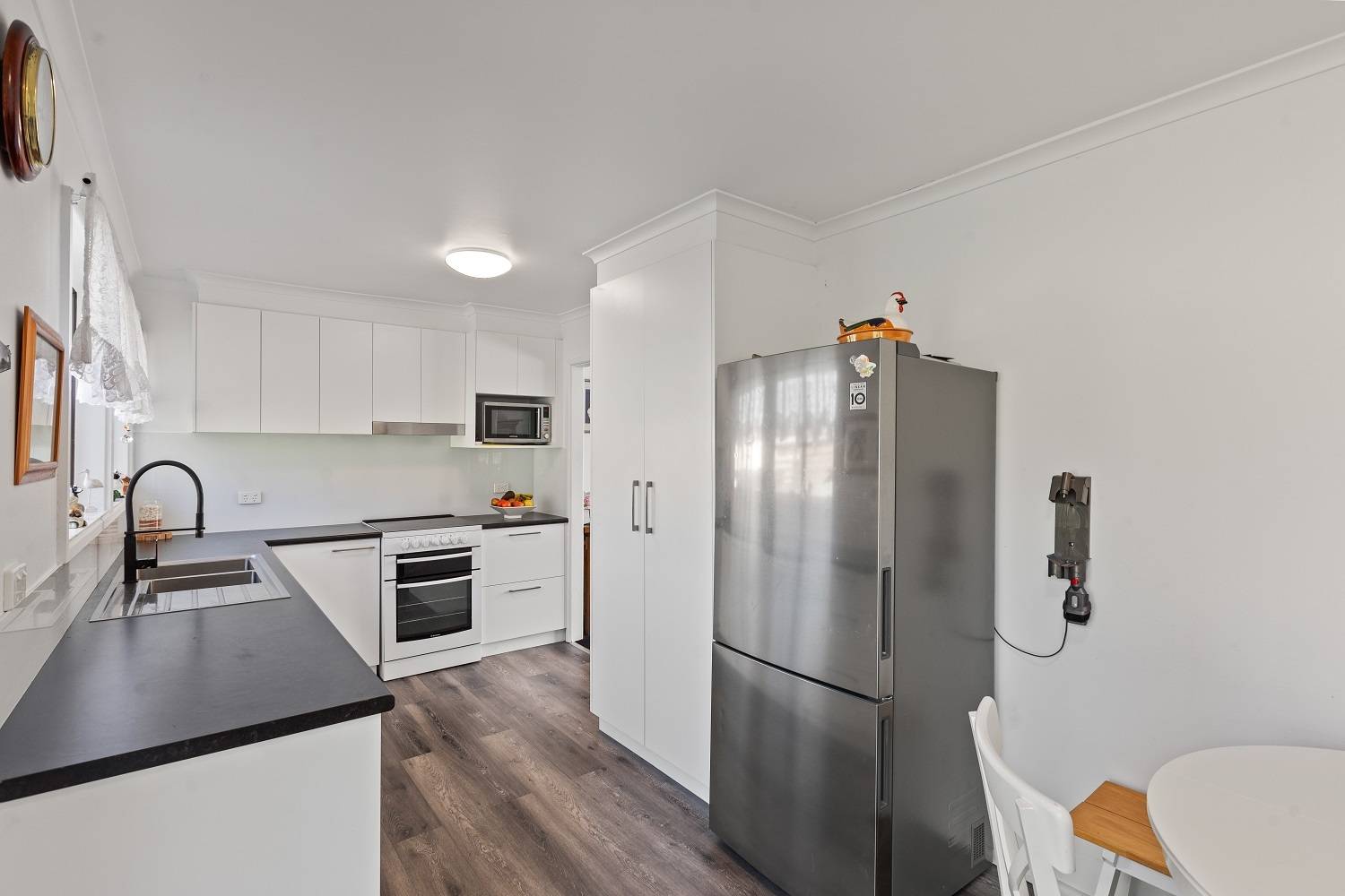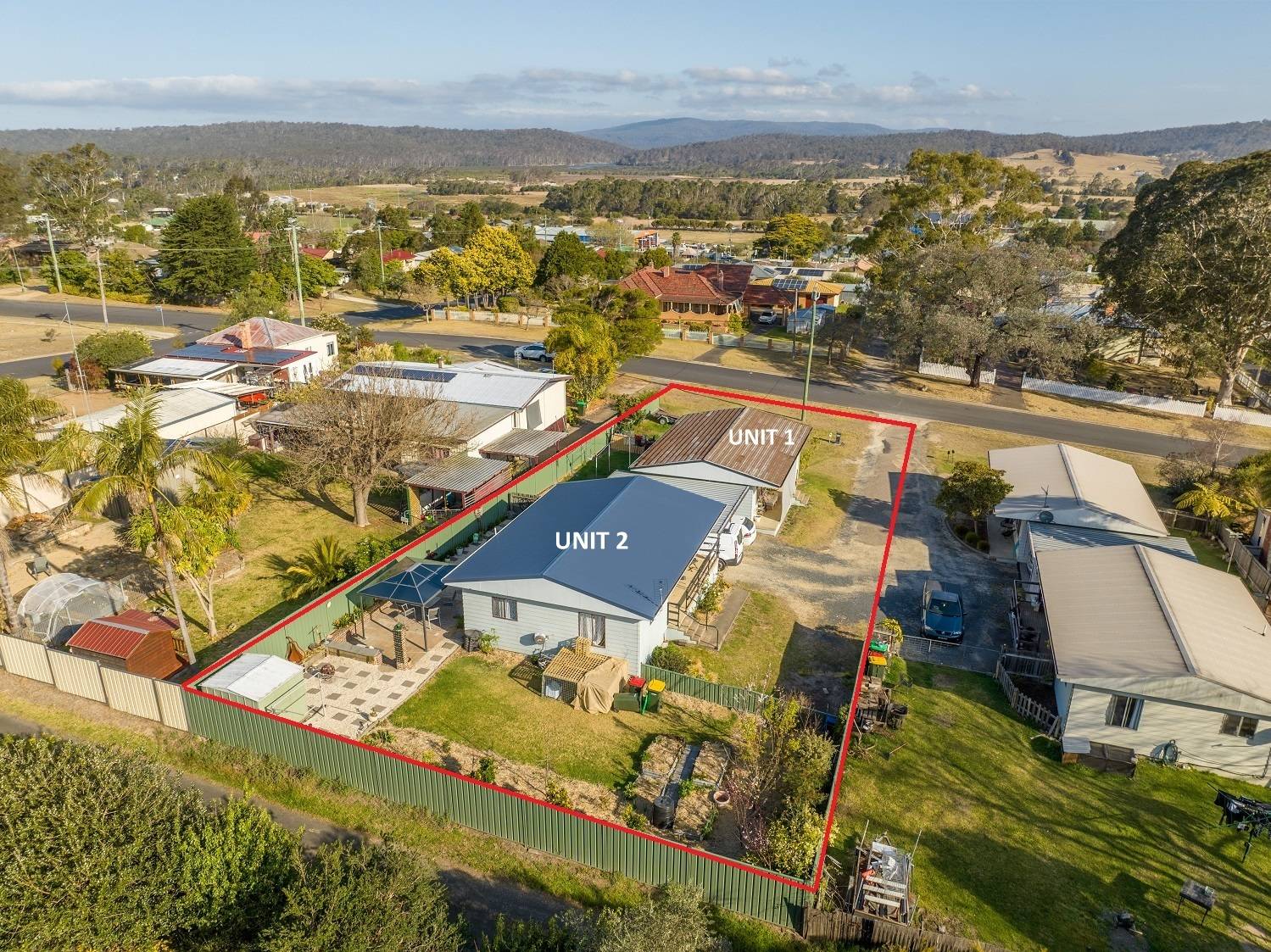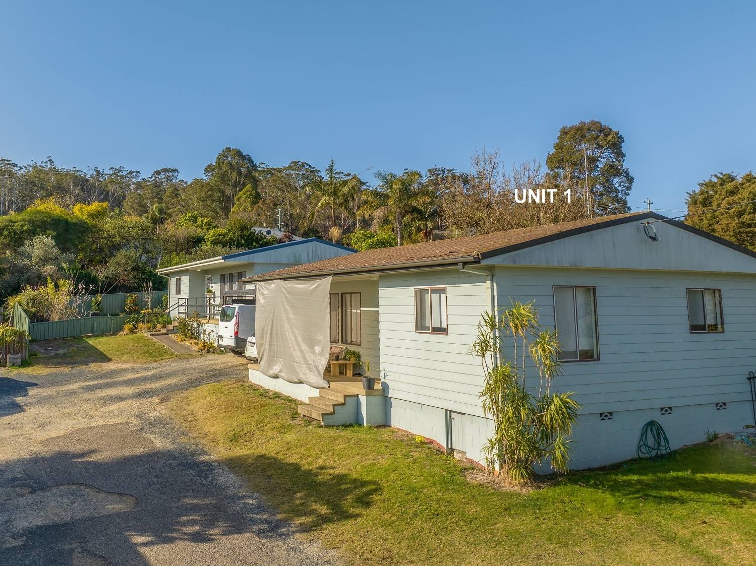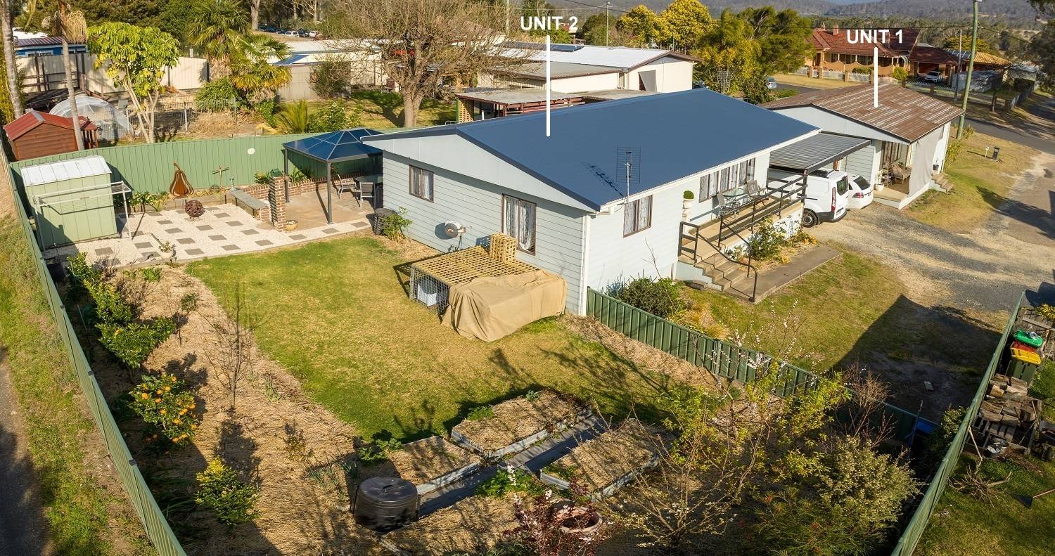 Right in the heart of Pambula, large (984m2) elevated block, big wide street, lane to the rear and not one but 2 dwellings, each with 2 bedrooms (BIRs), generous living (split system) out to front under roof patio, kitchen, adjacent dining out to private yards, practical bathroom  and under cover parking with laundry/store. Wait, there’s more! Unit 2 has been completely renovated internally to as new condition, with huge private yard including paved gazebo/courtyard area, raised veggie gardens, fruit trees and l/u garden/store shed. Unit 1 is spic and span throughout and currently tenanted (good returns), private yard and plenty of off street parking. Owner occupier, investor, downsizer or astute purchaser – the choice is clear.