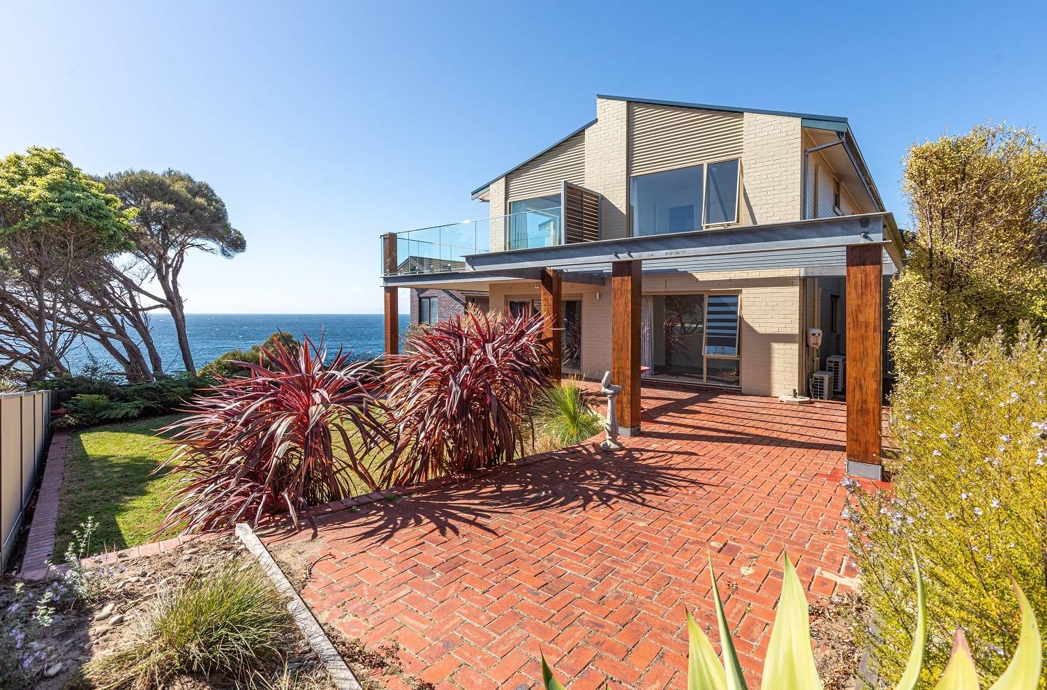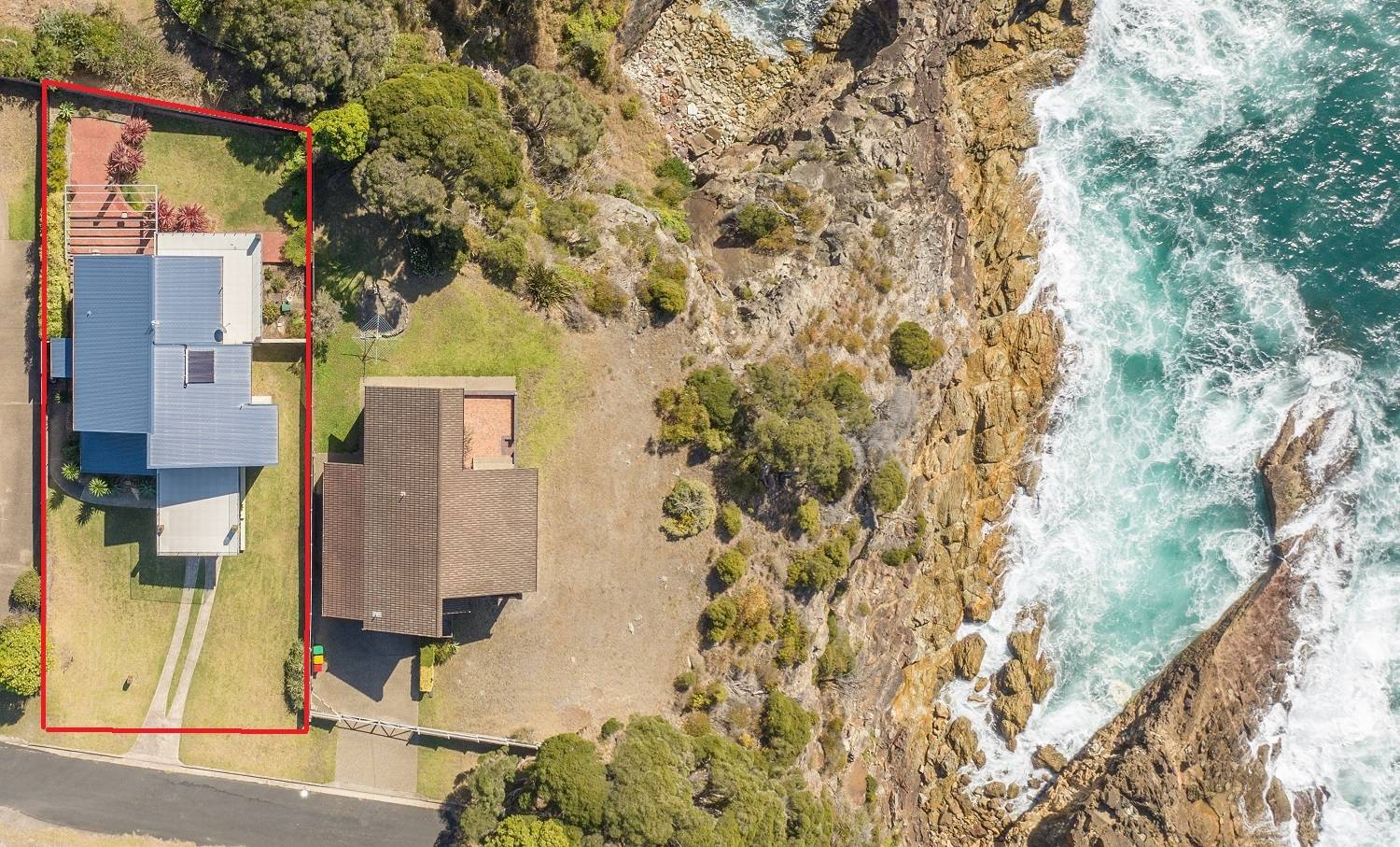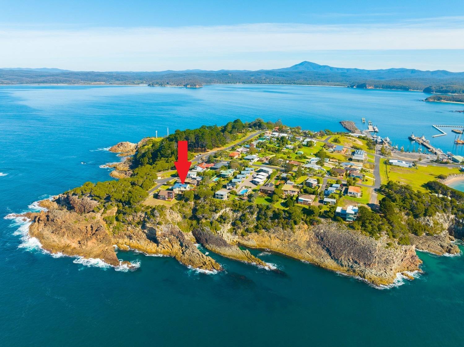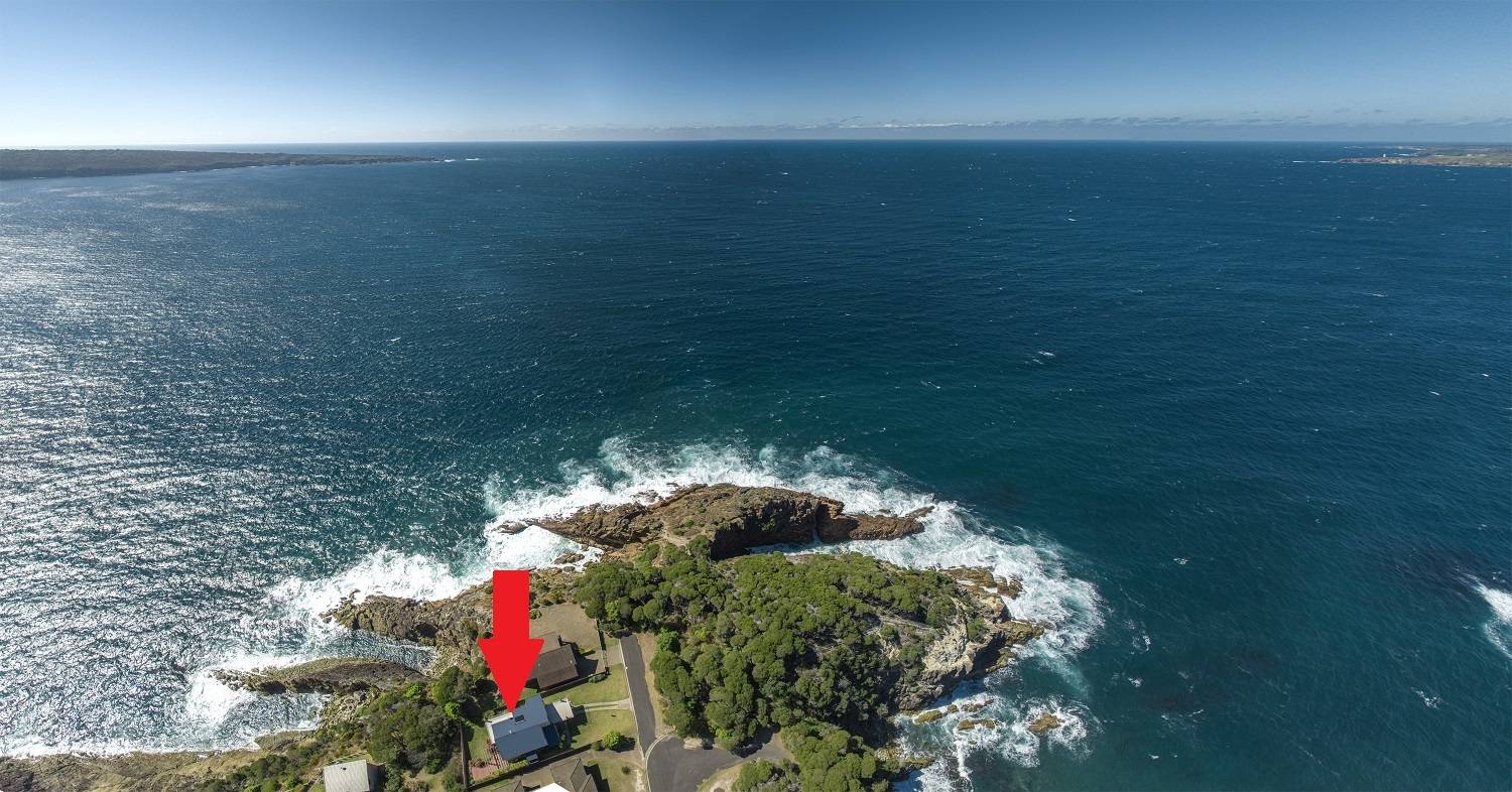 Clinging to a thin peninsula protruding into the magnificence of Twofold Bay, accessed by a short lane with cliff top nature reserve out front and to the rear, spine tingling views of the bay and the great expanse of the incomparable South Pacific Ocean, sentinel-like, double brick, 3 bedroom residence perfectly accented to compliment the irreplaceable surrounds. Riveting living and dining rooms that are the best seats in the house where ‘living in the view’ is taken to the next level with floor to ceiling windows, out to extensive tiled decking to the enjoy the sweet salt water breezes. Large, fully equipped kitchen, adjacent family room (split system) with spectacular cedar lined vaulted ceilings which flow through from the main living room and informal dining out to an enormous tiled balcony surveying the adjacent coastal reserve. Master bedroom with picture windows to luxuriate in the view, complete with ensuite & WIR. Downstairs, executive lift if required, to a fabulous third living area/studio/guest accom (amazing views) with loads of built in cupboards, kitchenette, adjacent fully tiled “Ritz” bathroom (views of course) flowing out to a landscaped rear yard with the murmur of the sea ever present and includes a huge paved pergola utilizing mighty bridge timbers. Generously sized bedrooms 2 & 3 (BIRs), deluxe laundry, internal access double garage with adjoining double under balcony parking. One of the greats – never to be repeated!
