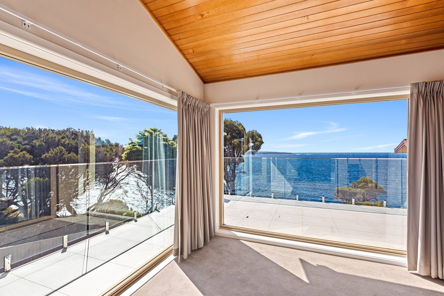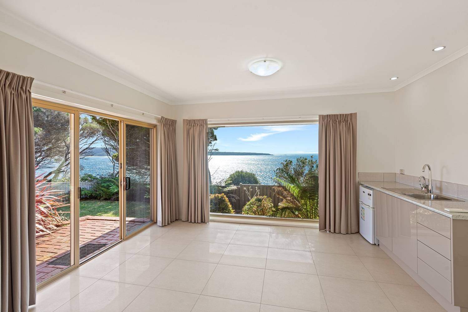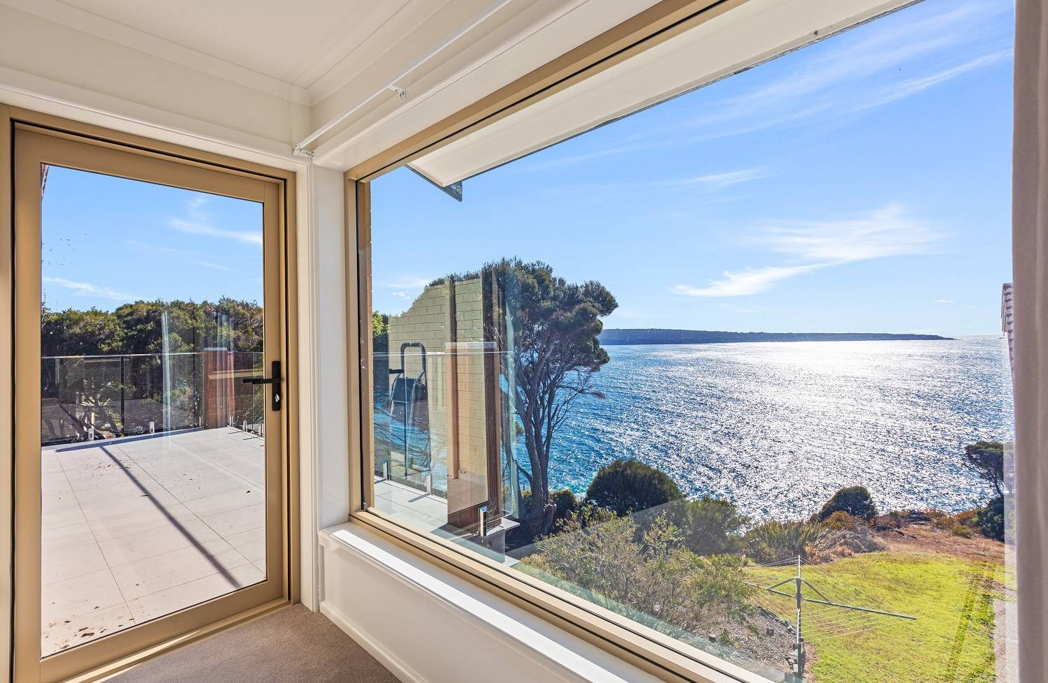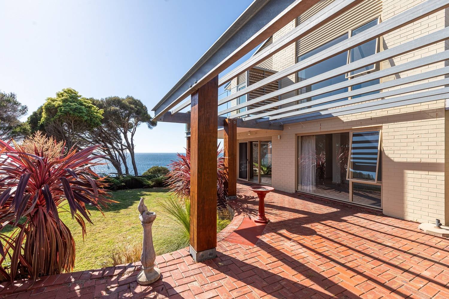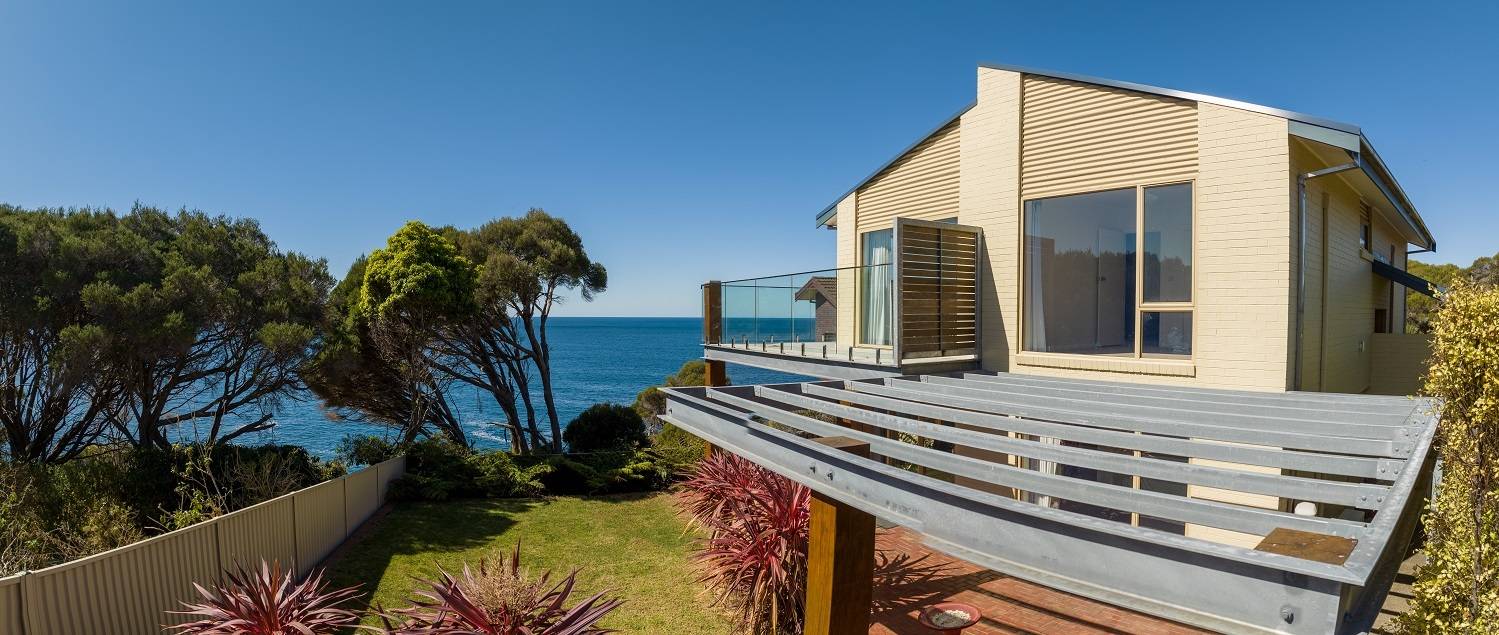 Clinging to a thin peninsula protruding into the magnificence of Twofold Bay, accessed by a short lane with cliff top nature reserve out front and to the rear, spine tingling views of the bay and the great expanse of the incomparable South Pacific Ocean, sentinel-like, double brick, 3 bedroom residence perfectly accented to compliment the irreplaceable surrounds. Riveting living and dining rooms that are the best seats in the house where ‘living in the view’ is taken to the next level with floor to ceiling windows, out to extensive tiled decking to the enjoy the sweet salt water breezes. Large, fully equipped kitchen, adjacent family room (split system) with spectacular cedar lined vaulted ceilings which flow through from the main living room and informal dining out to an enormous tiled balcony surveying the adjacent coastal reserve. Master bedroom with picture windows to luxuriate in the view, complete with ensuite & WIR. Downstairs, executive lift if required, to a fabulous third living area/studio/guest accom (amazing views) with loads of built in cupboards, kitchenette, adjacent fully tiled “Ritz” bathroom (views of course) flowing out to a landscaped rear yard with the murmur of the sea ever present and includes a huge paved pergola utilizing mighty bridge timbers. Generously sized bedrooms 2 & 3 (BIRs), deluxe laundry, internal access double garage with adjoining double under balcony parking. One of the greats – never to be repeated!