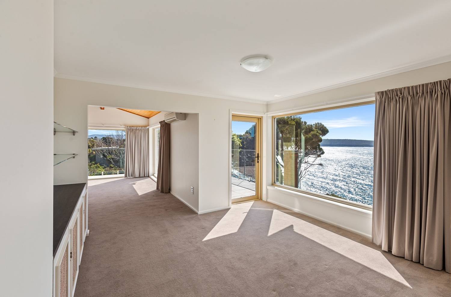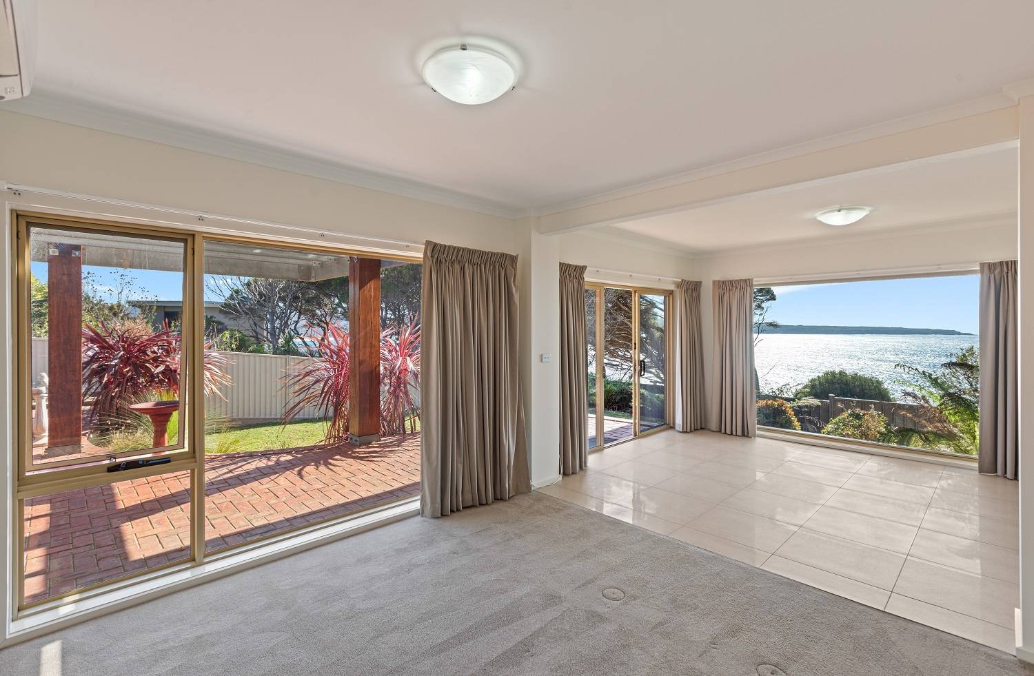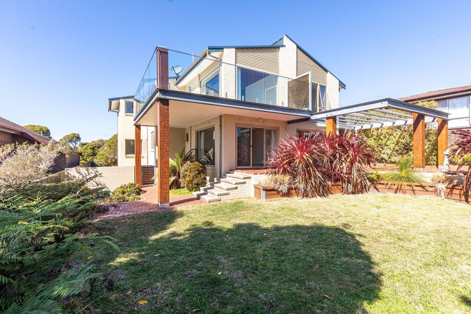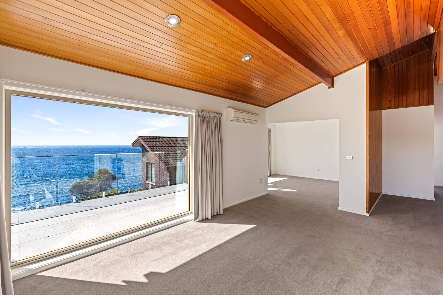 Clinging to a thin peninsula protruding into the magnificence of Twofold Bay, accessed by a short lane with cliff top nature reserve out front and to the rear, spine tingling views of the bay and the great expanse of the incomparable South Pacific Ocean, sentinel-like, double brick, 3 bedroom residence perfectly accented to compliment the irreplaceable surrounds. Riveting living and dining rooms that are the best seats in the house where ‘living in the view’ is taken to the next level with floor to ceiling windows, out to extensive tiled decking to the enjoy the sweet salt water breezes. Large, fully equipped kitchen, adjacent family room (split system) with spectacular cedar lined vaulted ceilings which flow through from the main living room and informal dining out to an enormous tiled balcony surveying the adjacent coastal reserve. Master bedroom with picture windows to luxuriate in the view, complete with ensuite & WIR. Downstairs, executive lift if required, to a fabulous third living area/studio/guest accom (amazing views) with loads of built in cupboards, kitchenette, adjacent fully tiled “Ritz” bathroom (views of course) flowing out to a landscaped rear yard with the murmur of the sea ever present and includes a huge paved pergola utilizing mighty bridge timbers. Generously sized bedrooms 2 & 3 (BIRs), deluxe laundry, internal access double garage with adjoining double under balcony parking. One of the greats – never to be repeated!