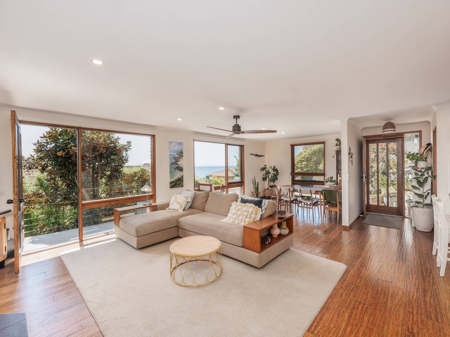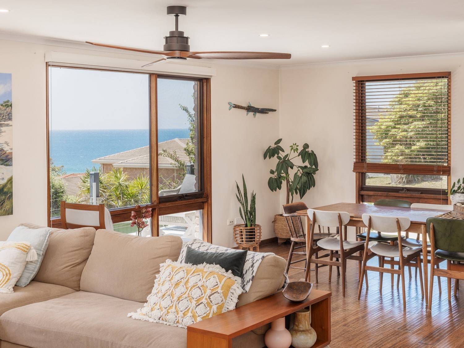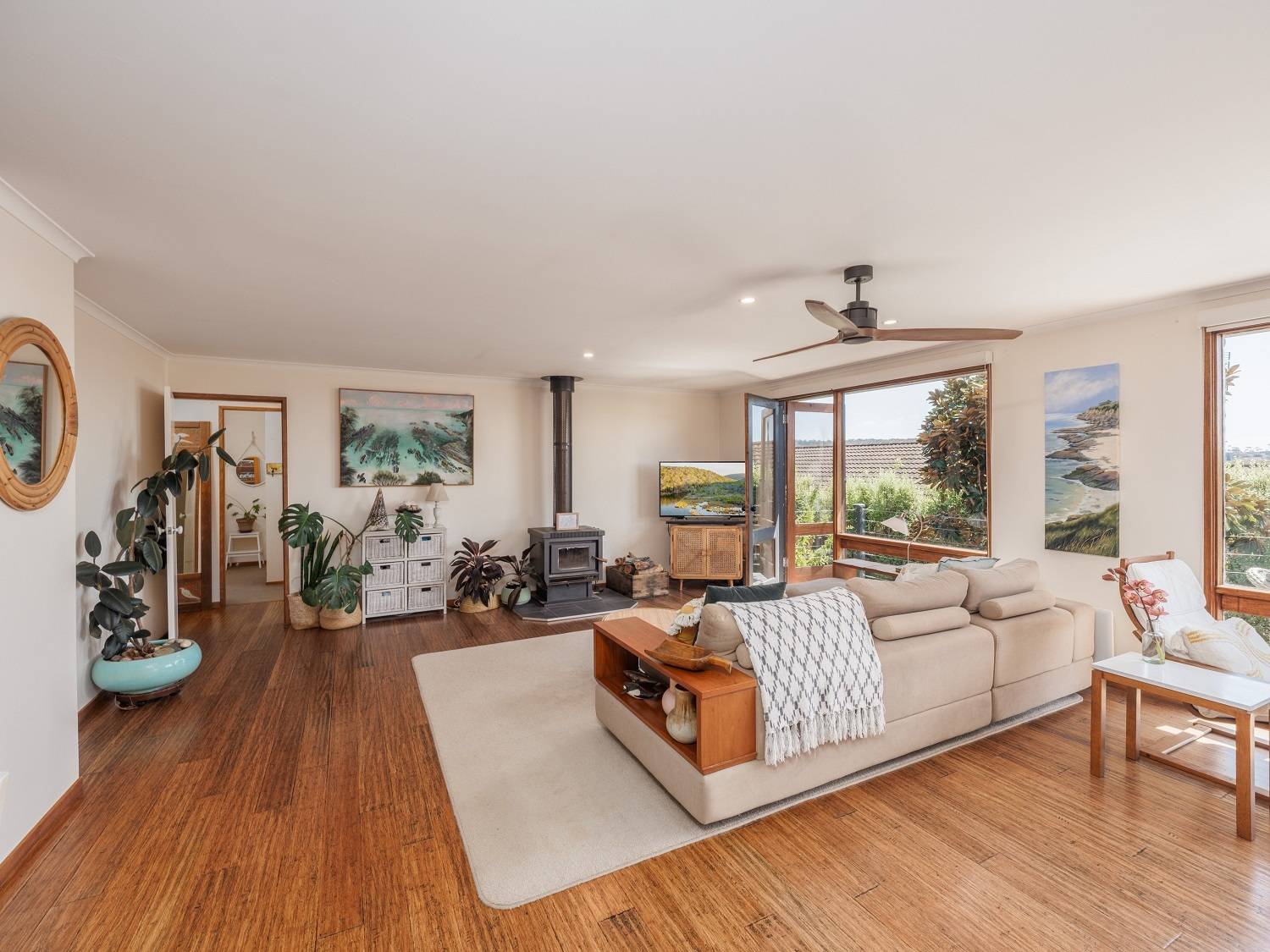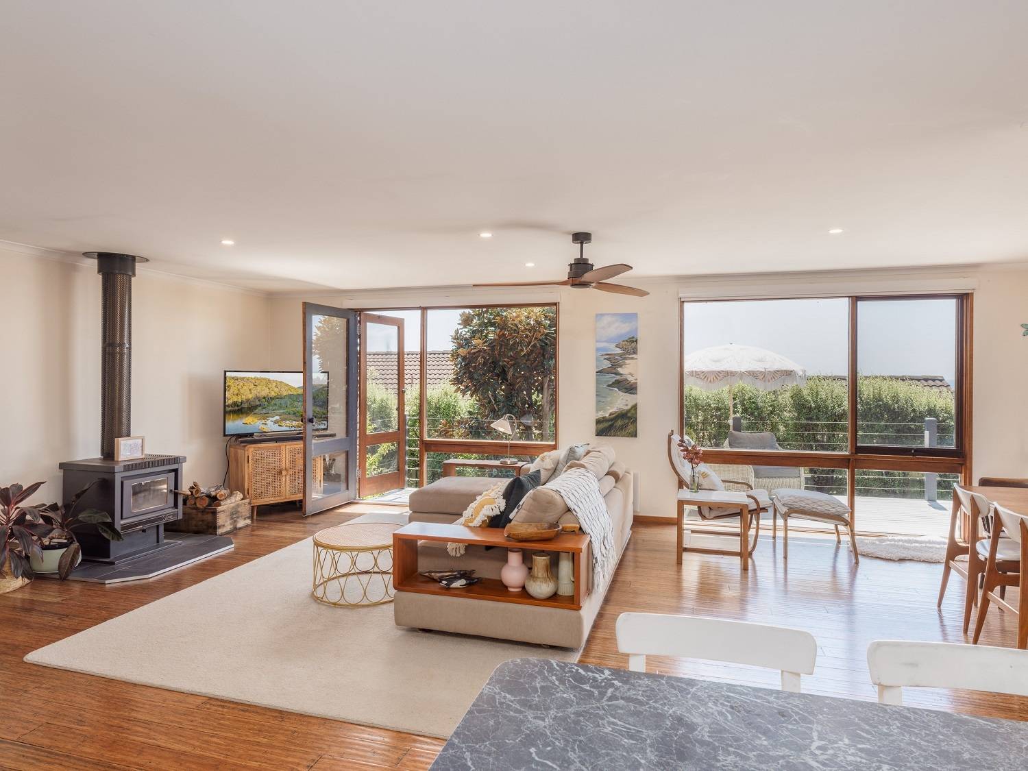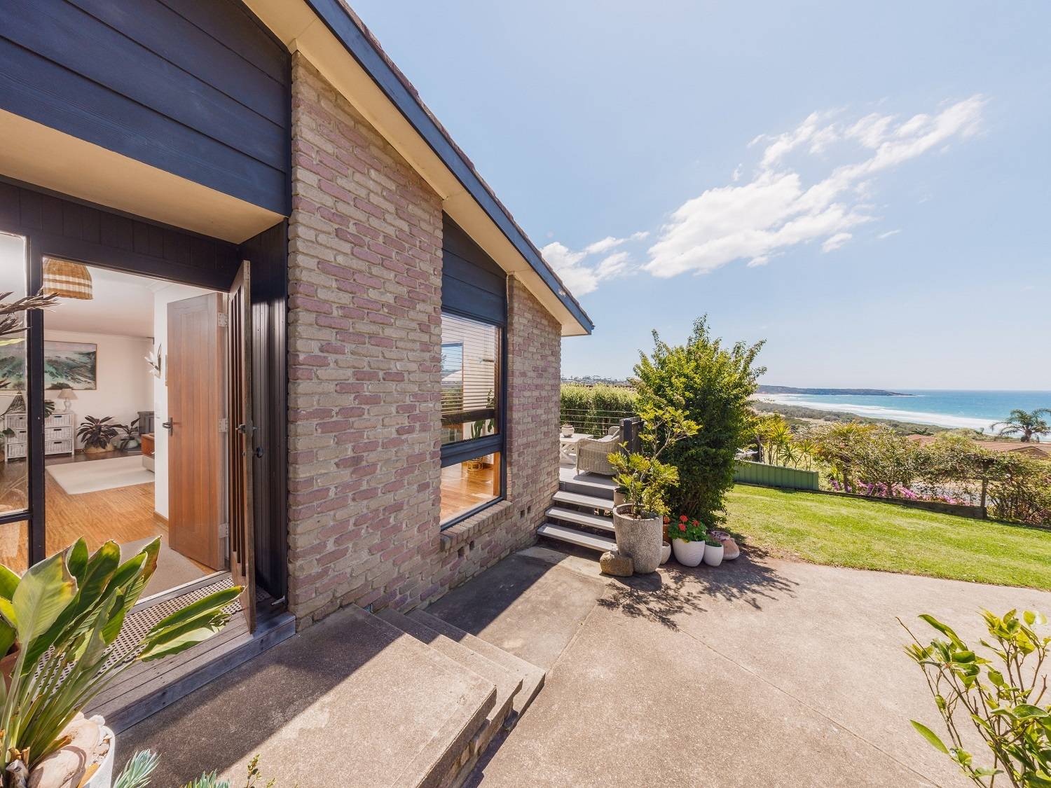 Nestled at the cul de sac end of a quiet street in one of Tura Beaches most sought after niche locations, just footsteps (20m) from coastal reserve with the beach and golf course at the bottom of the street (300m approx) a special secret awaits. With open ocean and beach views to mesmerize, through the classic timber screen door into the fabulous light-filled 3 bedroom home boasting the perfect sheltered Northerly aspect and comprising generous open living and dining areas (wood fire for cosy winter nights) with durable bamboo flooring flowing out to a private deck to revel in the sweet sea breezes and the amazing water views. Well appointed laminex kitchen featuring induction cooking, quality appliances and breakfast bar, king sized master (plenty of robe space), good sized second and third BR’s (BIR’s BR 2), bathroom including vanity, bath, shower plus sep wc & laundry. Then outside to the fully established surrounds,  5.5kw BTG solar system, easy access driveway through to the rear yard resplendent with raised vegie gardens, numerous established plantings including several fruit and a must have mulberry tree. Your special place.