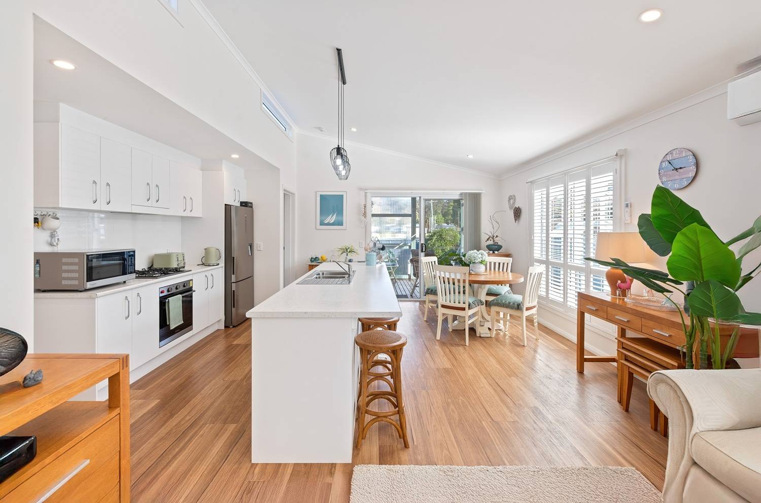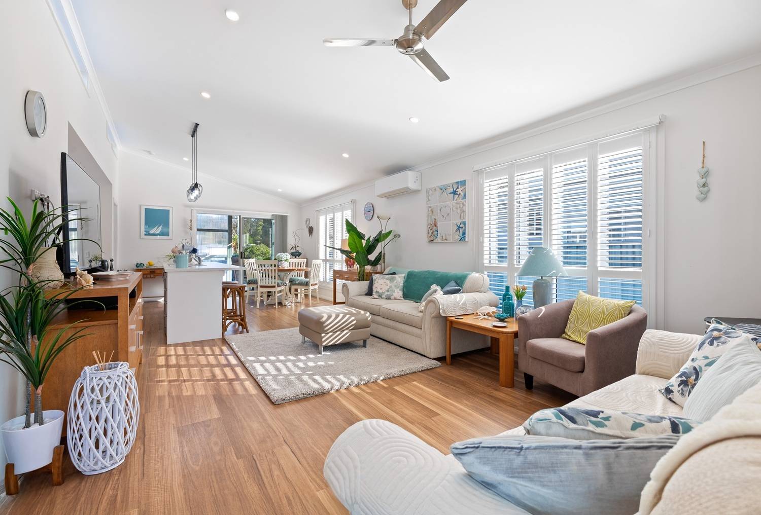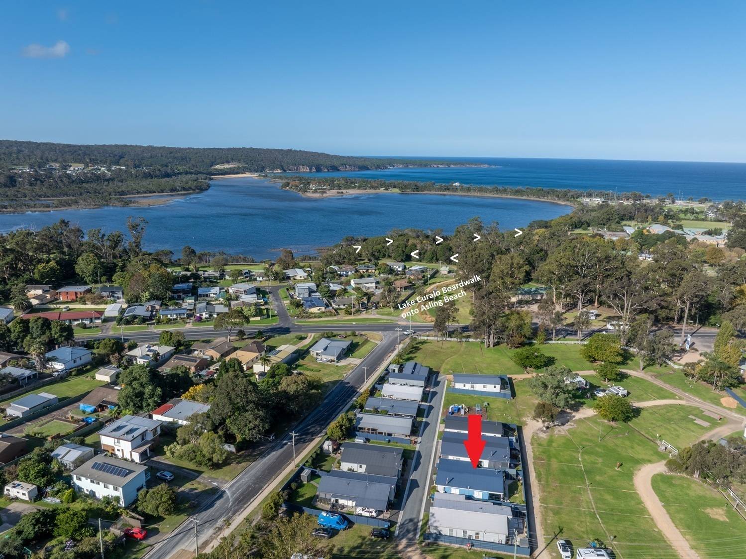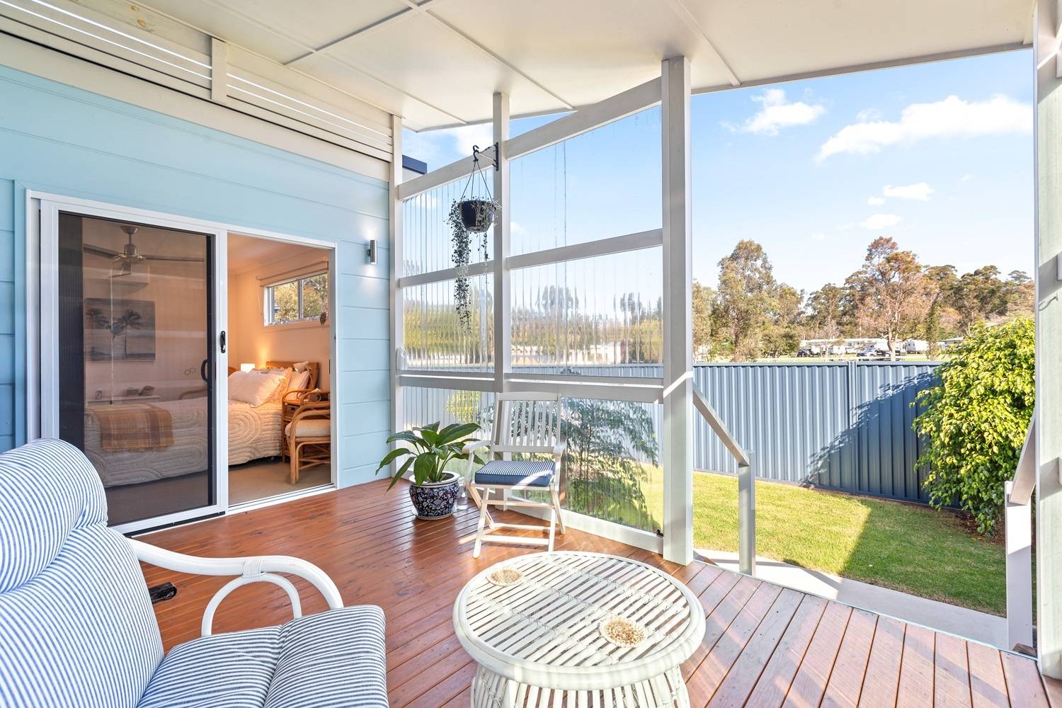High spec 2 bedroom plus study/3rd br beach house nestled in the sheltered park-like setting of Gateway Holiday Park Eden, situated only 200m from Lake Curalo boardwalk which winds its way around to the white sands of award winning Aslings Beach. Immaculate throughout, the long list of features include huge open plan living & dining (split system & s/c heating) with majestic raked ceilings and clerestory windows for the morning sun, adjoining front verandah and to the rear, an under-roof deck/bbq area, magic fully equipped kitchen with double-door pantry, s/s appliances and large island bench/breakfast bar. Generous bedrooms, master with beaut walk in robe, fully tiled ensuite and rear deck access, mirrored robes (br2), gleaming fully tiled main bathroom and laundry (loads of storage).  Established surrounds which include fully fenced rear yard, garden/storage shed and generous carport suitable for boat/caravan etc. Lifestyle living at its best with site fees at only $162.50 per week. Just kick back, relax & enjoy.