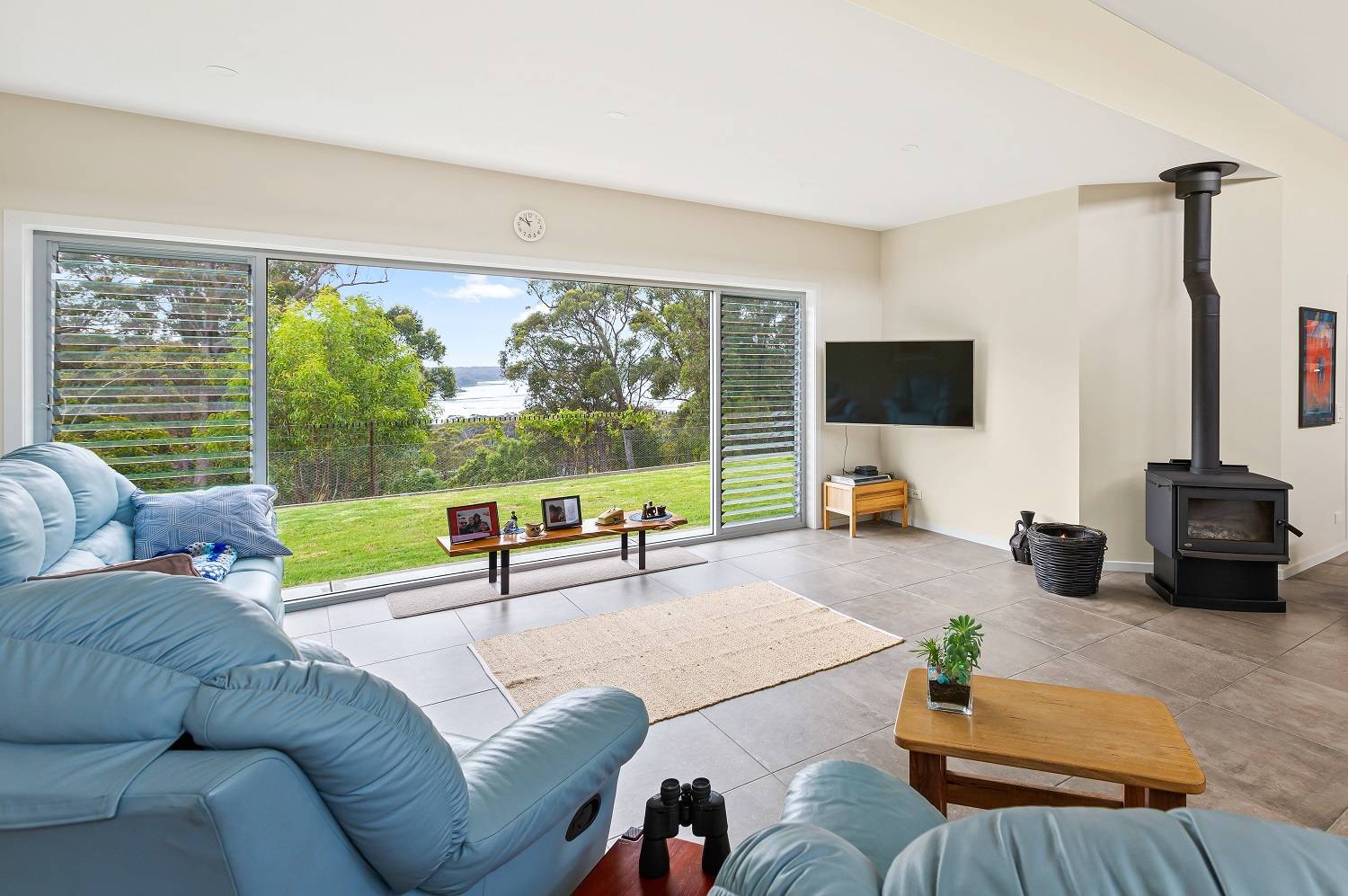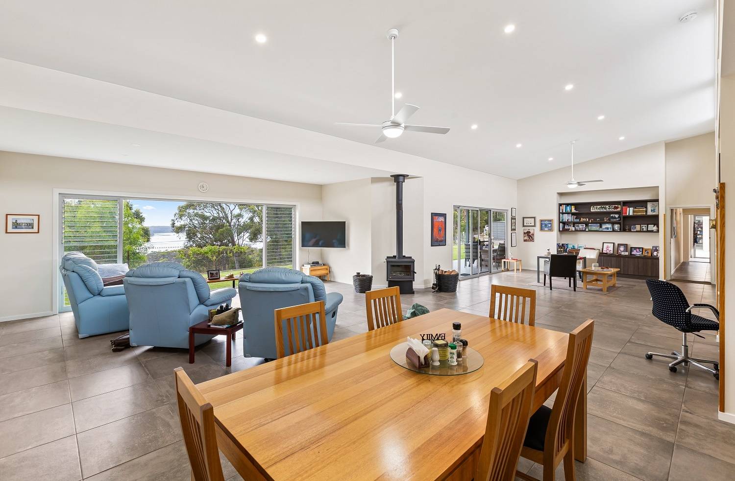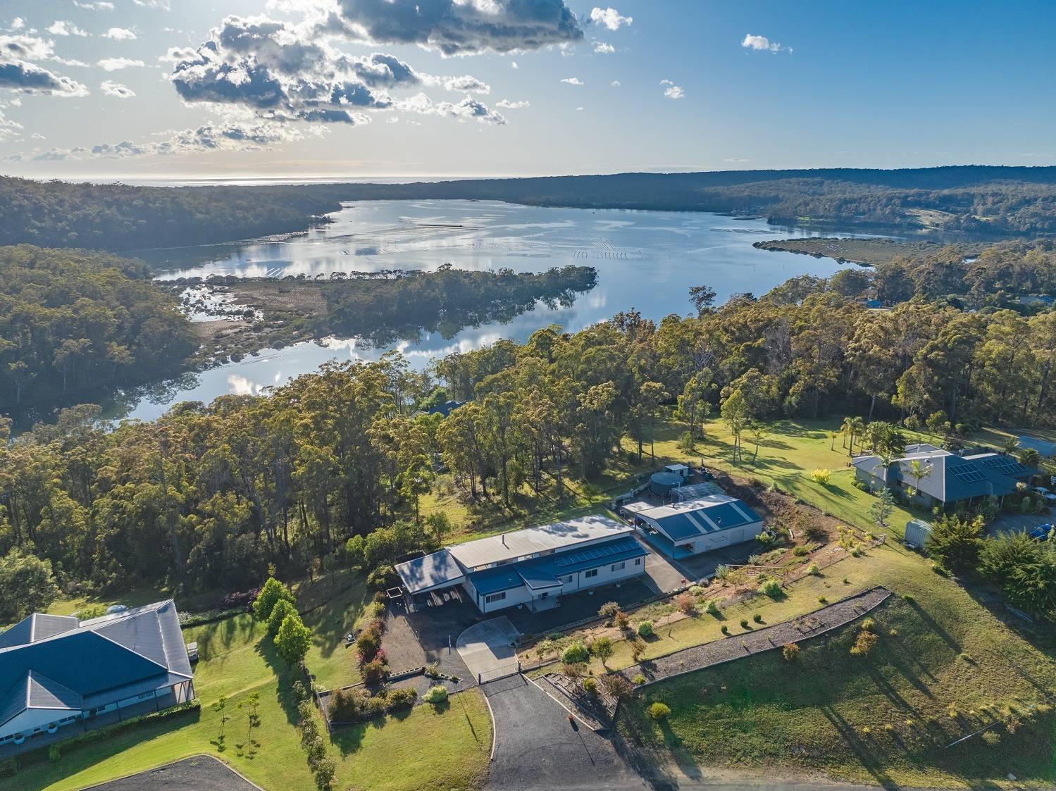 Privately tucked away in the ever in demand locality of Broadwater, absolutely stunning 3 bedroom dream residence perfectly sited on 1¼ captivating acres providing sheltered privacy whilst maximizing the hypnotic every changing water views across the incomparable Pambula Lake estuary. Upon entry to the residence, a shot of adrenalin hits as the volume and amenity of the vast living space becomes apparent, with raked ceilings and tiled flooring (s/c heater & split system) flowing out through a wall of glass to the vast under roof alfresco living area to enjoy the incredible outlook and gentle salt scented breezes. At the fulcrum of this amazing living space is a fully appointed executive kitchen with bespoke joinery (featured throughout the house), breakfast bar and vast butler’s pantry. The master suite features direct patio access, designer ensuite inc his and hers vanities, huge shower and WIR, king sized 2nd & 3rd bedrooms with BIRs. Main bathroom (shower, bath, vanity) plus sep wc/powder room, country laundry with ample storage and hanging space. The fully established surrounds include a fantastic shed/garage 16m x 12m in size with attached pitched open area of 16 x 3.6m plus full bathroom facilities and kitchenette. The property is fully fenced with raised and netted veggie gardens, town and tank water, BTG solar and even an automatic front gate giving easy access to an oversized double carport and parking area. Brilliantly situated just 2 mins (drive) from Pambula Lake, boat ramp and famous oyster sheds, and 5 mins from historic Pambula Village (airport extra 2). Forever yours.