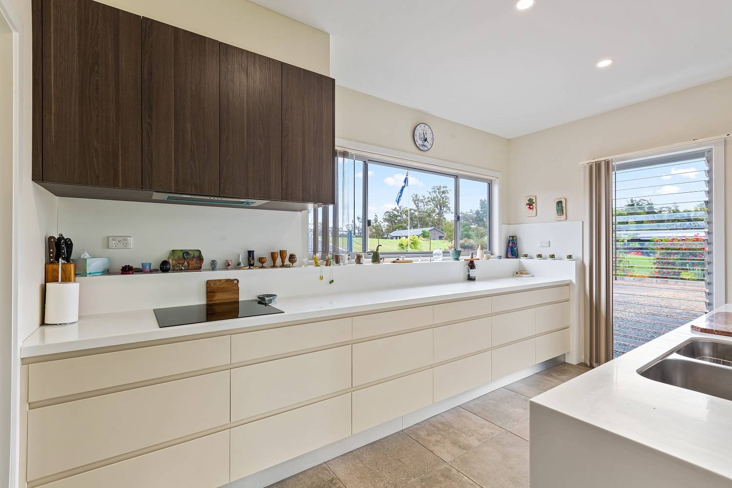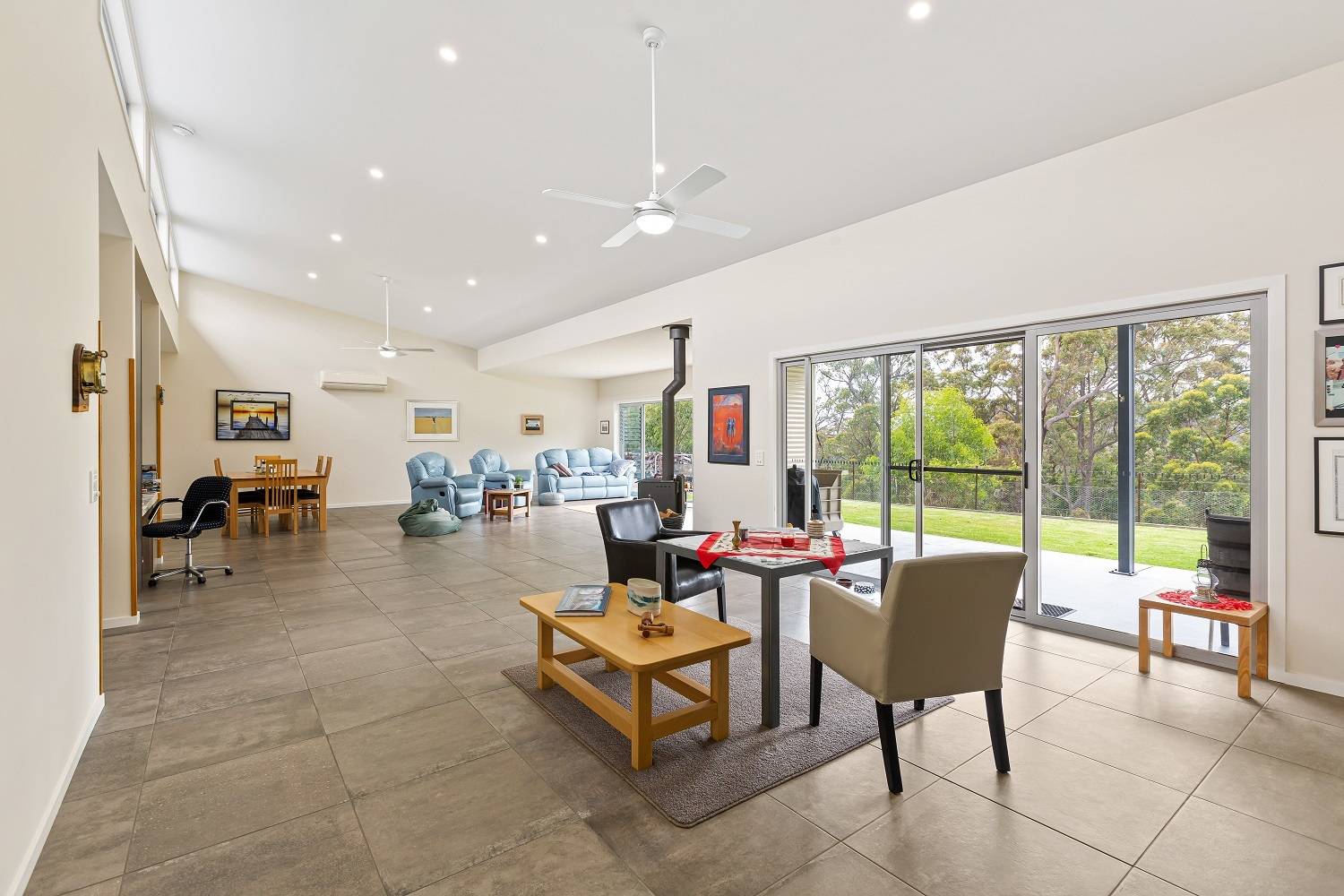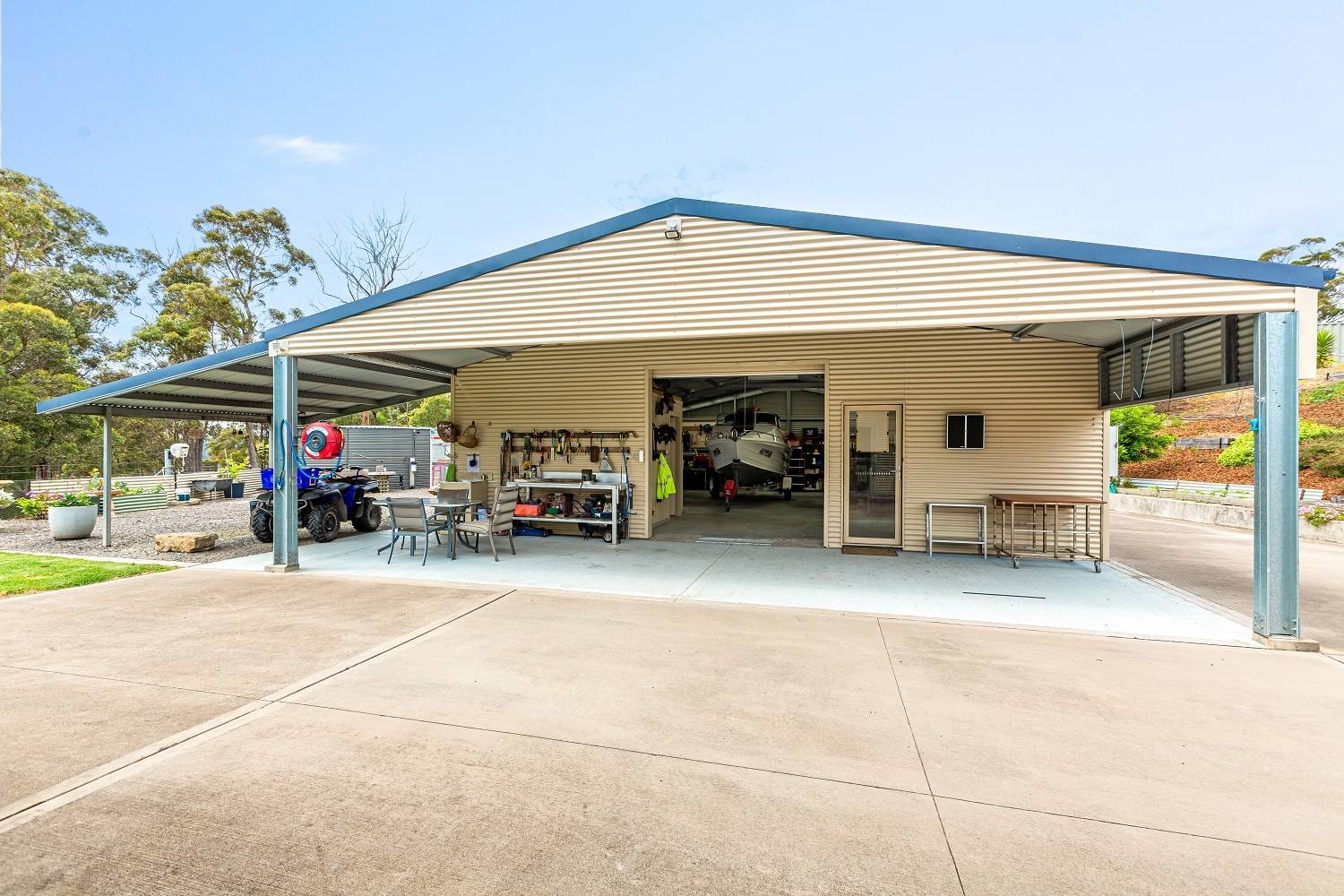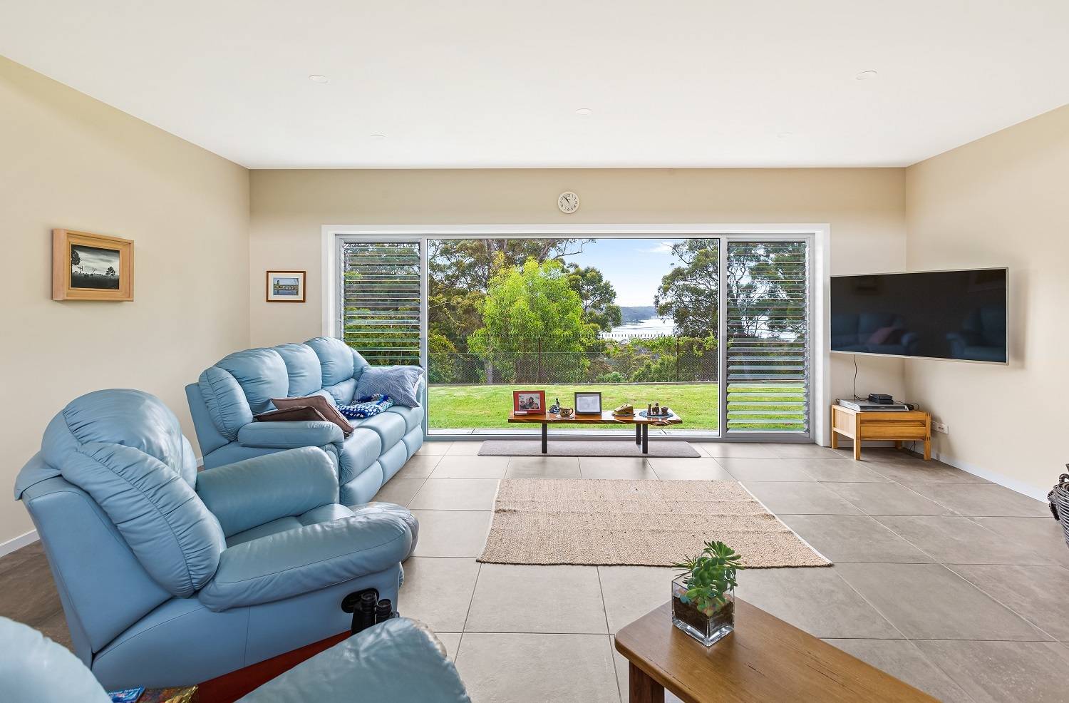 Privately tucked away in the ever in demand locality of Broadwater, absolutely stunning 3 bedroom dream residence perfectly sited on 1¼ captivating acres providing sheltered privacy whilst maximizing the hypnotic every changing water views across the incomparable Pambula Lake estuary. Upon entry to the residence, a shot of adrenalin hits as the volume and amenity of the vast living space becomes apparent, with raked ceilings and tiled flooring (s/c heater & split system) flowing out through a wall of glass to the vast under roof alfresco living area to enjoy the incredible outlook and gentle salt scented breezes. At the fulcrum of this amazing living space is a fully appointed executive kitchen with bespoke joinery (featured throughout the house), breakfast bar and vast butler’s pantry. The master suite features direct patio access, designer ensuite inc his and hers vanities, huge shower and WIR, king sized 2nd & 3rd bedrooms with BIRs. Main bathroom (shower, bath, vanity) plus sep wc/powder room, country laundry with ample storage and hanging space. The fully established surrounds include a fantastic shed/garage 16m x 12m in size with attached pitched open area of 16 x 3.6m plus full bathroom facilities and kitchenette. The property is fully fenced with raised and netted veggie gardens, town and tank water, BTG solar and even an automatic front gate giving easy access to an oversized double carport and parking area. Brilliantly situated just 2 mins (drive) from Pambula Lake, boat ramp and famous oyster sheds, and 5 mins from historic Pambula Village (airport extra 2). Forever yours.