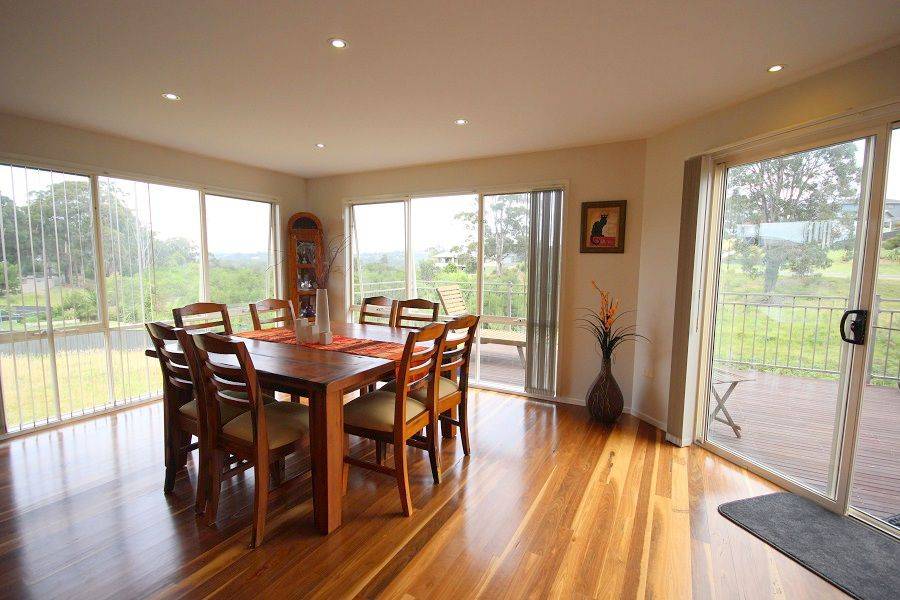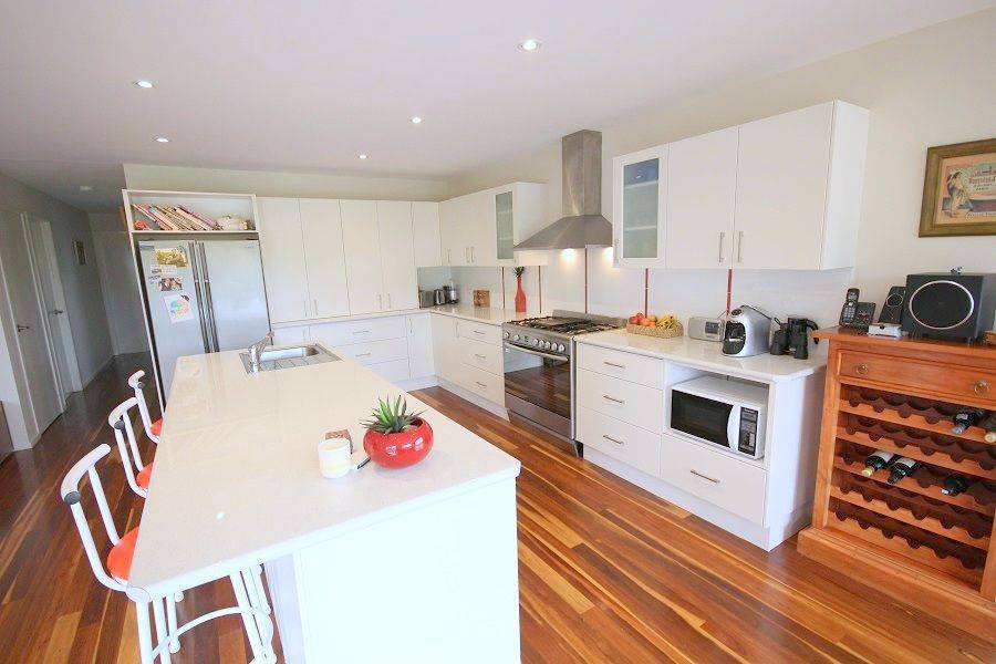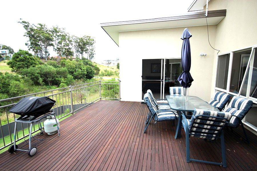 Stonking three bedroom designer plus study (4th BR) home set on a whopping 1067m2 block adjoining foreshore reserve giving direct foot access to the boardwalk (200m), Lake Curalo and around to award winning Aslings Beach. Light and airy throughout featuring impressive entrance to expansive open living with vaulted ceilings, fully appointed kitchen with breakfast bar joining family/dining out to large sun deck/outdoor living, lounge/TV room, master suite with WIR, generous ensuite and slider to deck, WIR and BIR to 2nd and 3rd BR, oversized double remote garage, separate access to roller doored under house workshop with huge storage area. Fully landscaped surrounds. Quality Eden Cove locality with attention grabbing designer home.